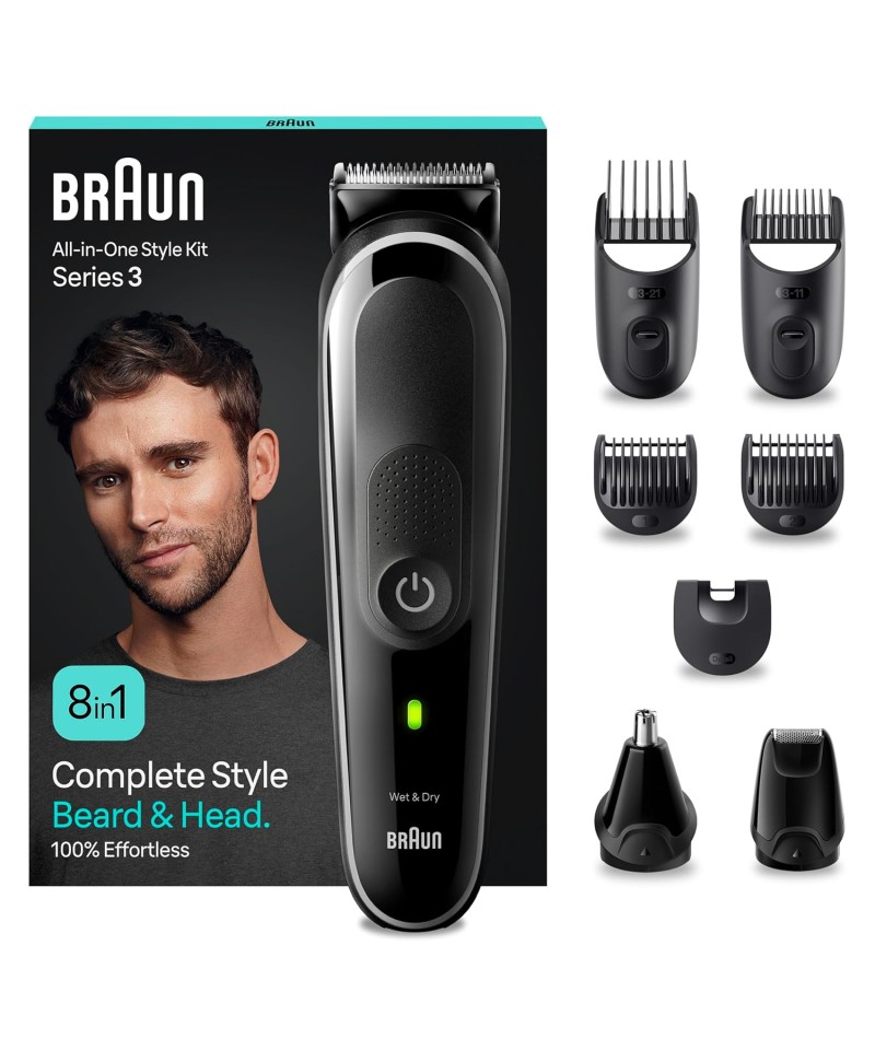Set de ingrijire 8 în 1 de la Braun pentru îndepărtarea părului din barbă și față: aparat de tuns barba, aparat de îngrijire corporală, aparat de tuns părul, aparat de tuns părul într-unul - instrumente selectate pentru tunderea bărbii, a părului din urechi și nas, bărbieritul și tunsul precis acasă.