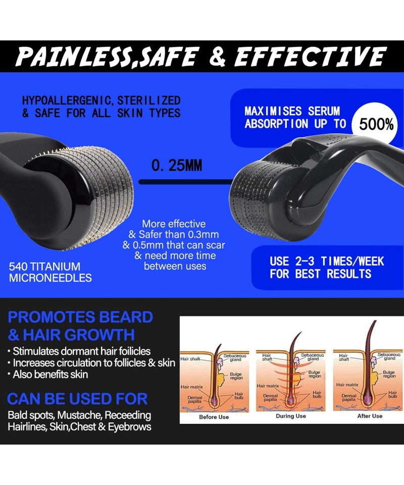 Rolă pentru barbă - Rola pentru barbă are o dimensiune a acului de 0,25 mm și are o lungime sigură pentru uz casnic. Curățați-o înainte de utilizare, rulați-o ușor înainte și înapoi de 5-10 ori - pe orizontală, verticală și diagonală, procesul nu este dureros (doar o senzație de furnicături), ajută și la combaterea ridurilor și îmbunătățește pigmentarea, activează procesul natural de vindecare al organismului, crește circulația sângelui.
