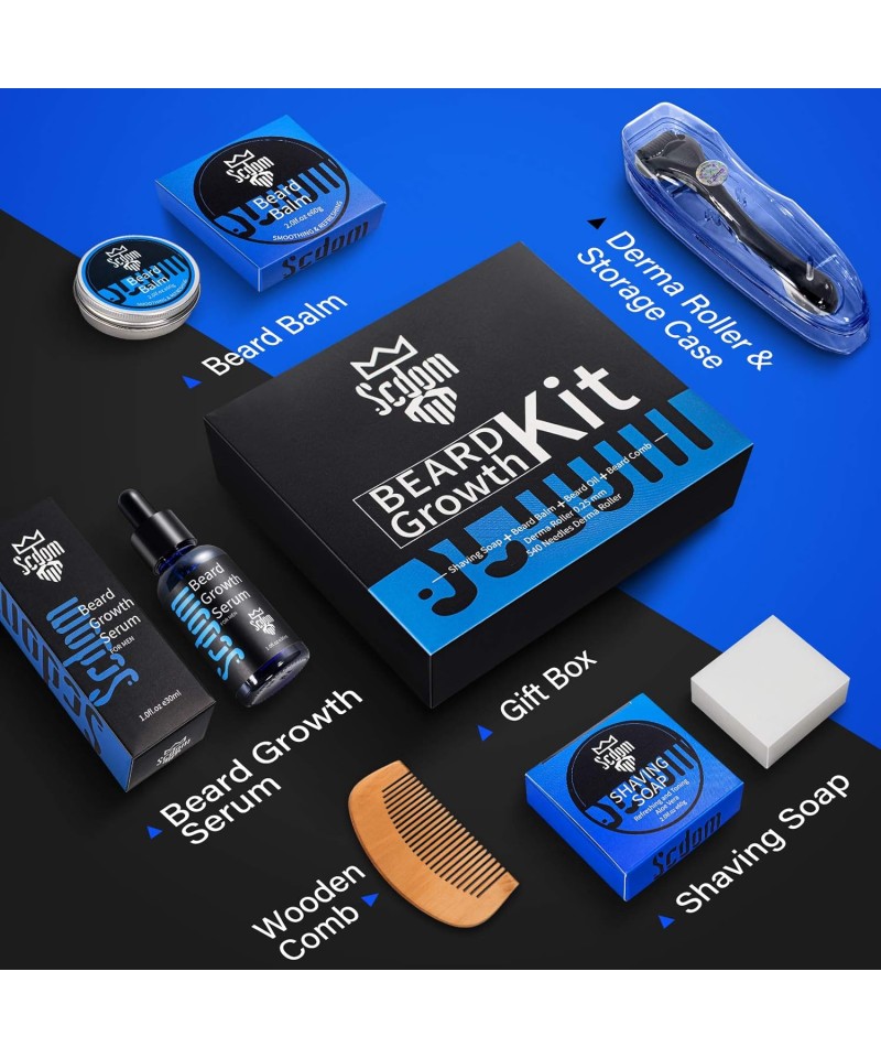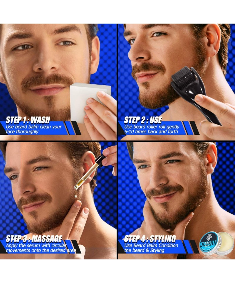 Kit pentru barbă - Special conceput pentru barba bărbătească, un kit pentru barbă conține cinci componente. Ser pentru creșterea bărbii, rolă din titan cu micro-ace, săpun de curățare a bărbii cu vitamine, ceară balsam și pieptene. Vei obține barbe mai groase și mai lungi, care te vor face mai masculin și mai încrezător. Arată-ți personalitatea matură și fermecătoare absolut perfect.