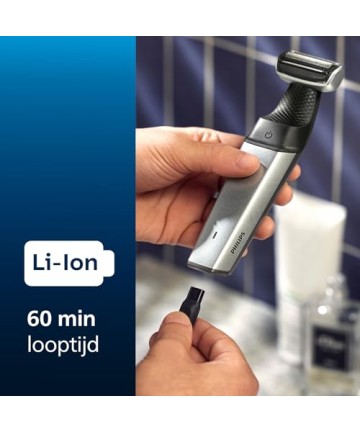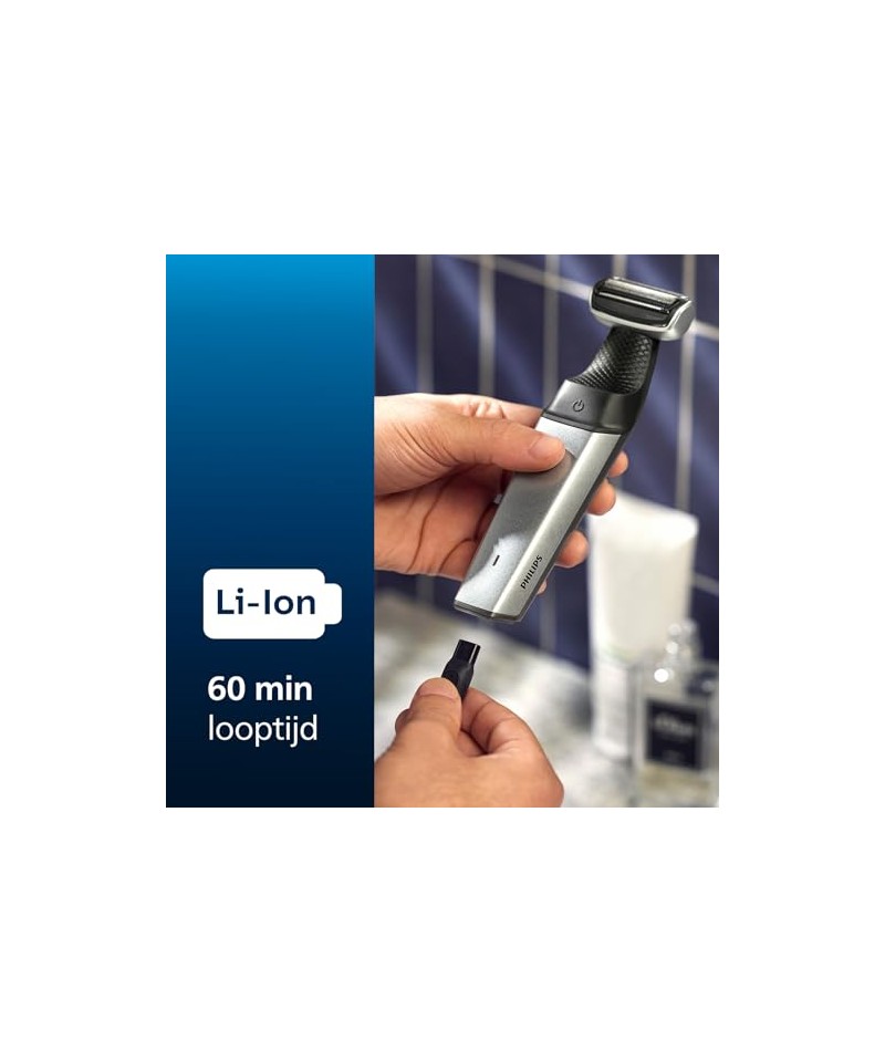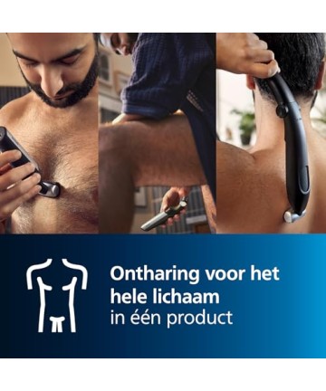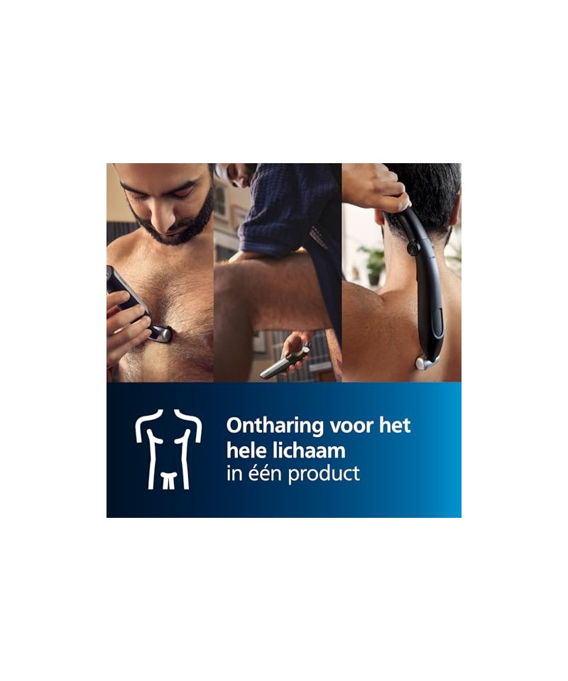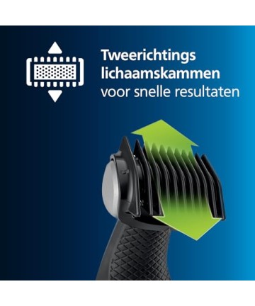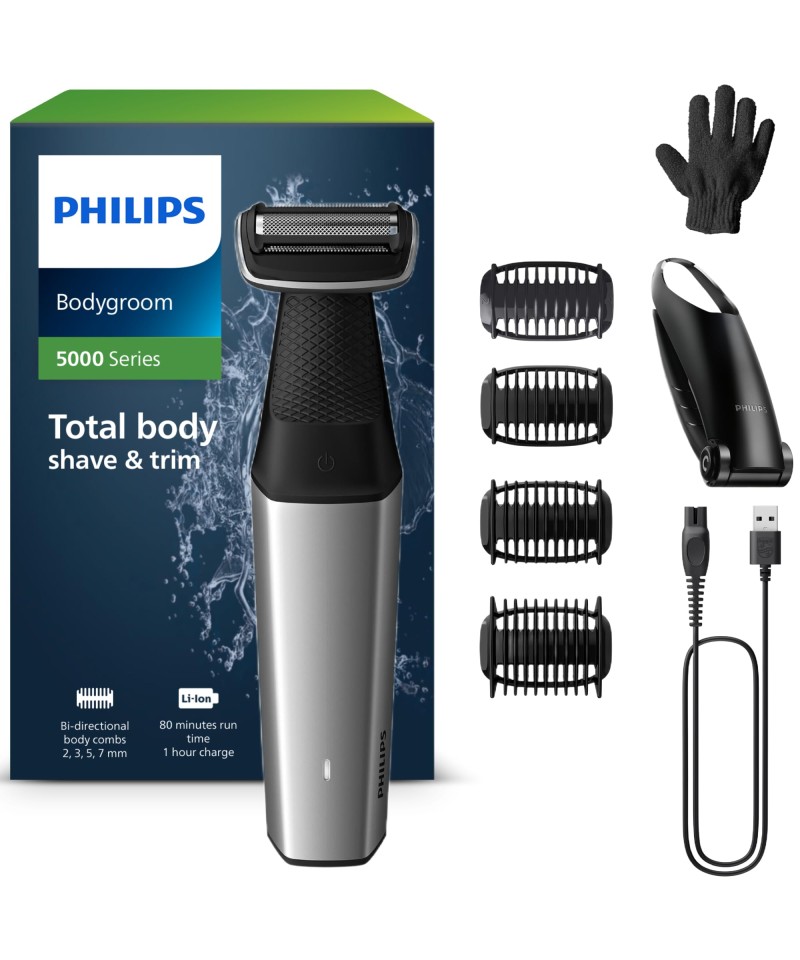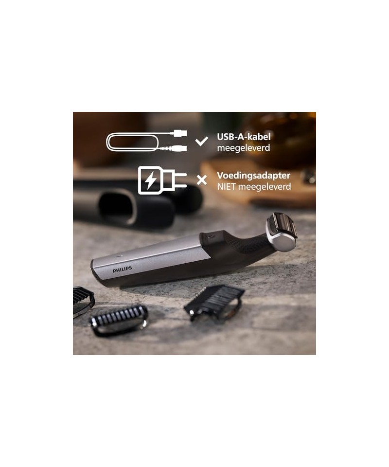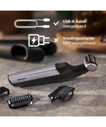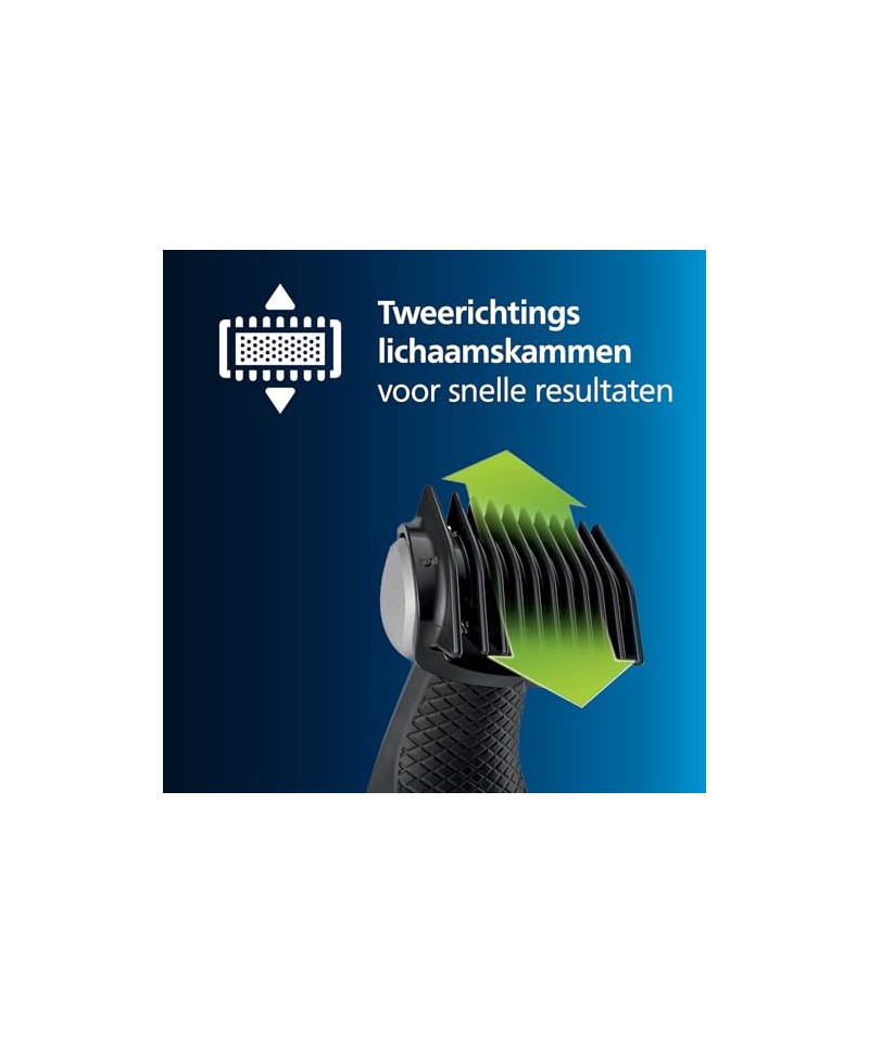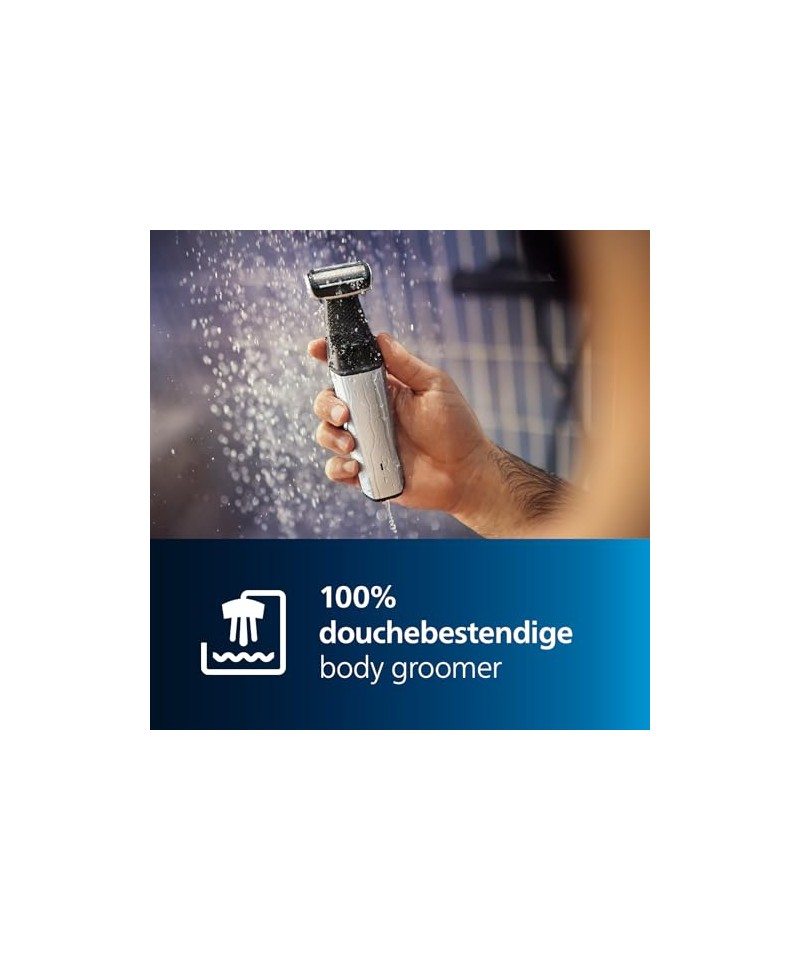 Setul include: 1 x piesă de mână Bodygroom, 4 x piepteni (2, 3, 5, 7 mm), 1 x accesoriu pentru spate, 1 x mănușă exfoliantă, 1 x cablu de încărcare USB-A; sursa de alimentare nu este inclusă.