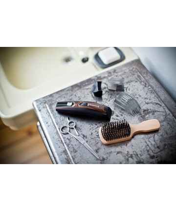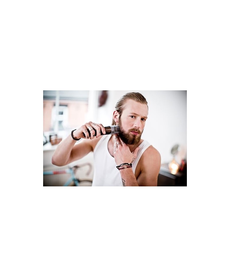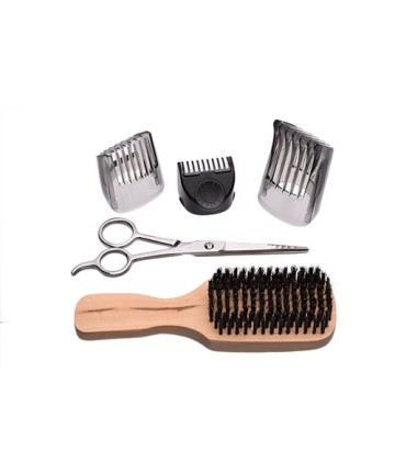 Set pentru tuns barba; Pieptene reglabil XL (20-35 mm), Pieptene reglabil scurt (1,5-18 mm), Trimmer pentru barba de mai multe zile (0.5-5 mm), Perie moale din păr de mistreț, Foarfecă de lux din oțel inoxidabil