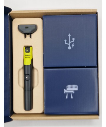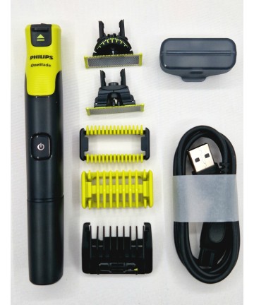 Setul conține: 1x Philips OneBlade 360 cu conexiune la aplicație, 1x lamă 360 pentru față, 1x lamă originală, 1x accesoriu de tundere reglabil 5-în-1 (1-5 mm), 1x kit pentru corp, 1x cablu USB-A; utilizați doar un adaptor USB certificat cu o mufă cu o tensiune de ieșire de 5,1 A pentru a încărca produsul