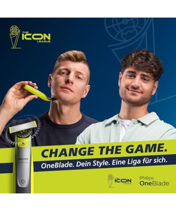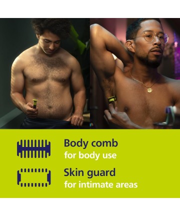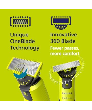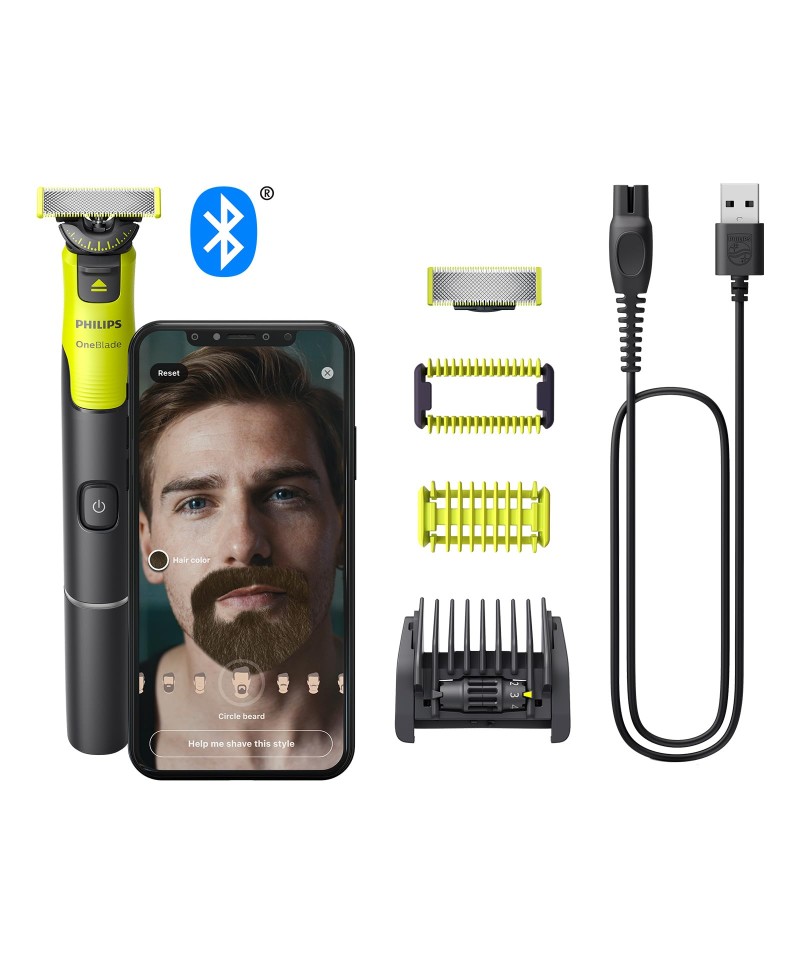 Philips OneBlade 360 Face + Body cu conexiune la aplicație este un aparat de styling hibrid revoluționar care poate tunde, rade și coafa linii și margini curate, indiferent de lungimea părului.