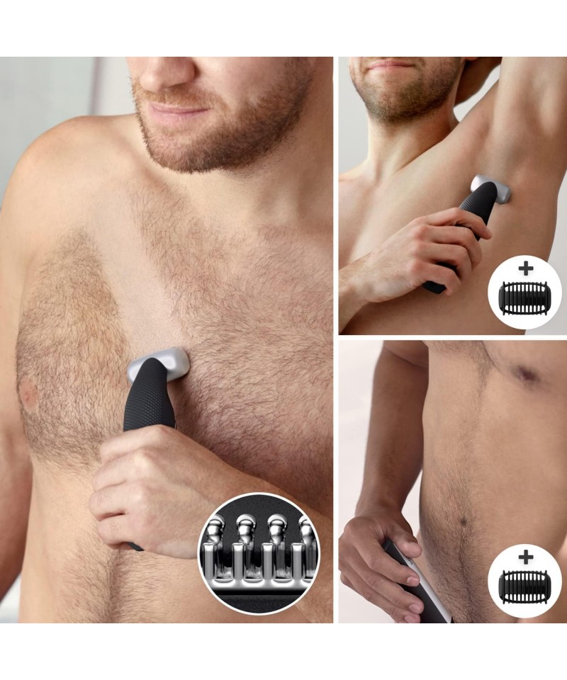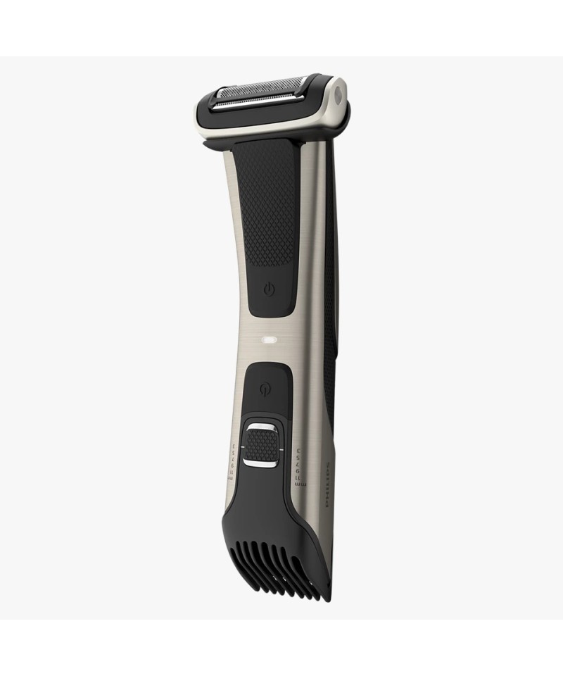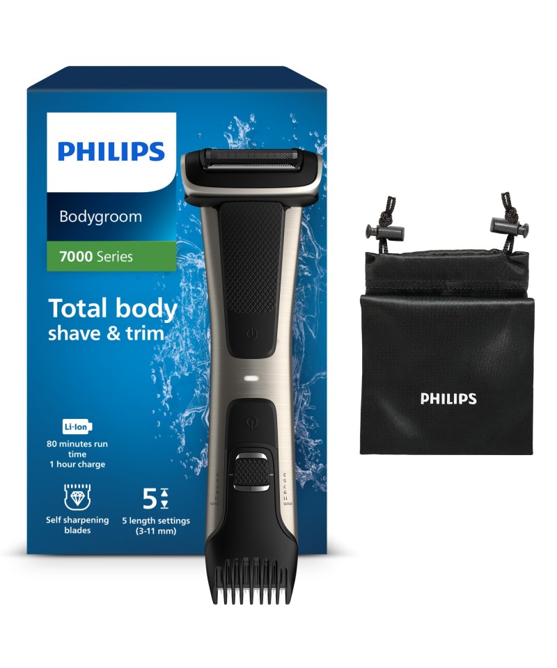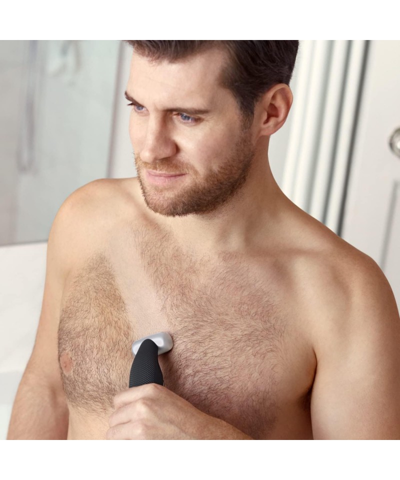 Foloseşte aparatul de tuns şi ras pentru întregul corp Philips Bodygroom 7000 pentru a tunde cu un singur accesoriu şi a obţine rezultate uniforme pe spate, umeri, piept, abdomen, braţe, picioare şi în zona axilară şi cea inghinală.