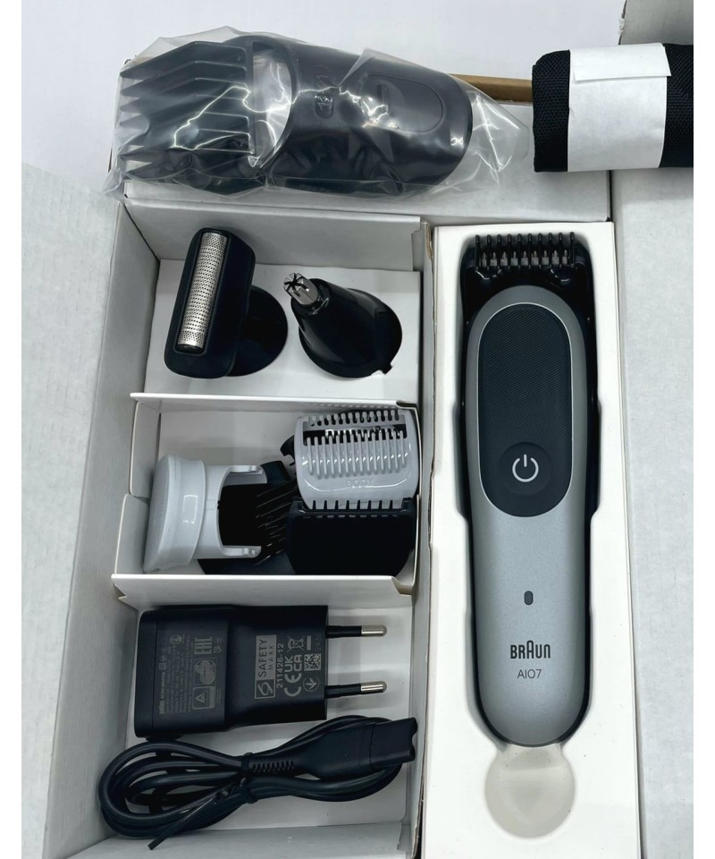 Conținutul cutiei: 1 aparat de tuns, 7 piepteni, 3 accesorii, 1 perie de curățare, 1 husă