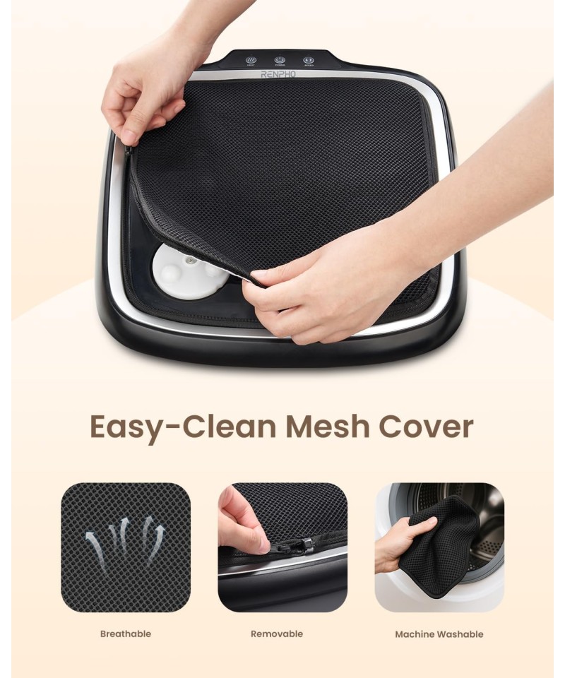 Design ușor de utilizat și sigur: Trei butoane ușor accesibile vă permit să comutați între modurile de masaj pentru picioare, gambe și gambe doar cu degetele de la picioare. Suportul ergonomic oferă suport confortabil pentru picioare în timpul utilizării, iar o funcție de oprire automată în 15 minute asigură o funcționare sigură. Capacul detașabil din plasă 3D facilitează curățarea.
