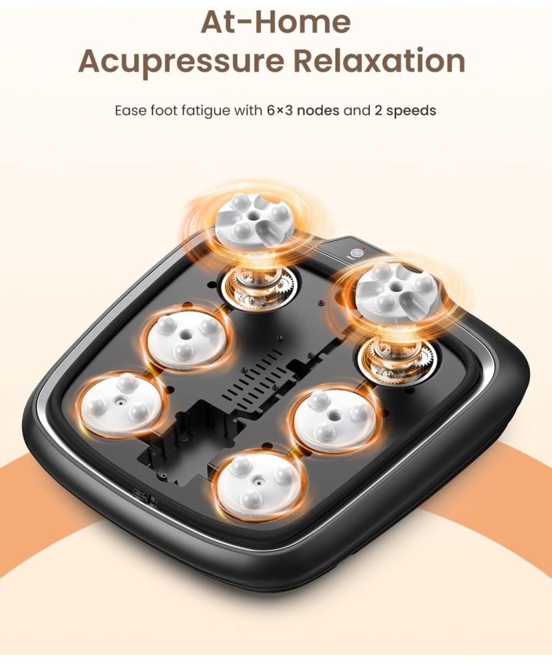 Frământare profundă în stil shiatsu cu căldură: Echipat cu 6 capete de masaj și 18 noduri rotative, acest aparat de masaj încălzit pentru picioare oferă un masaj profund al țesuturilor în stil shiatsu. Căldura adăugată sporește relaxarea, iar cu 2 viteze reglabile, puteți personaliza intensitatea pentru îmbunătățirea circulației la nivelul gambelor, relaxarea picioarelor și ameliorarea durerii de picioare.