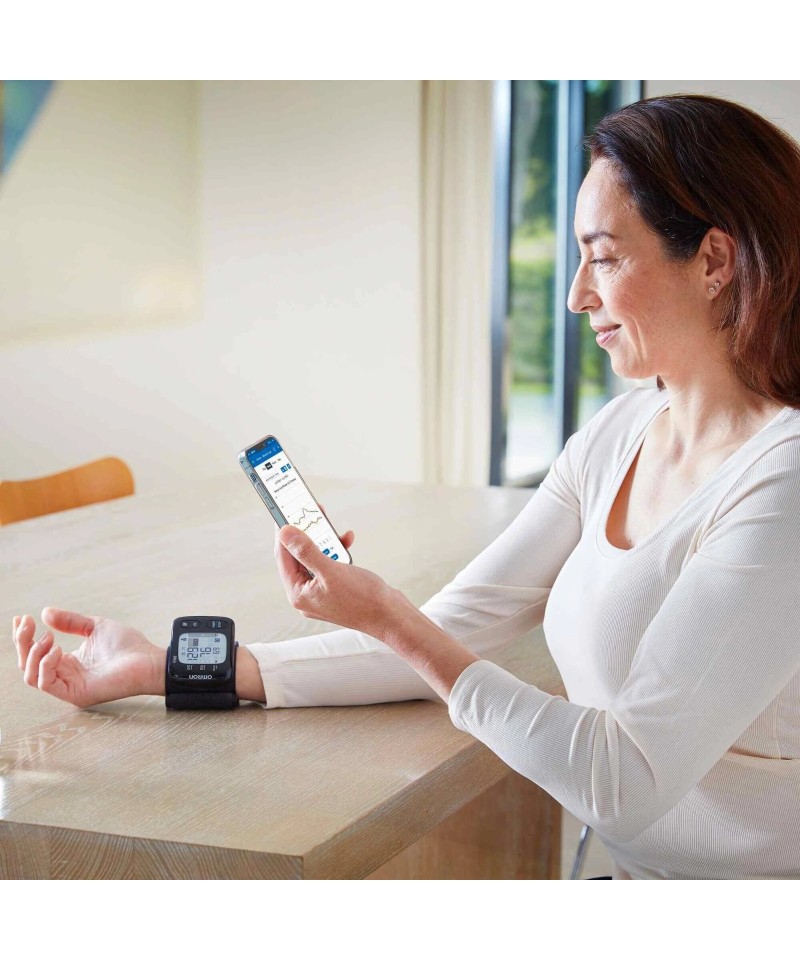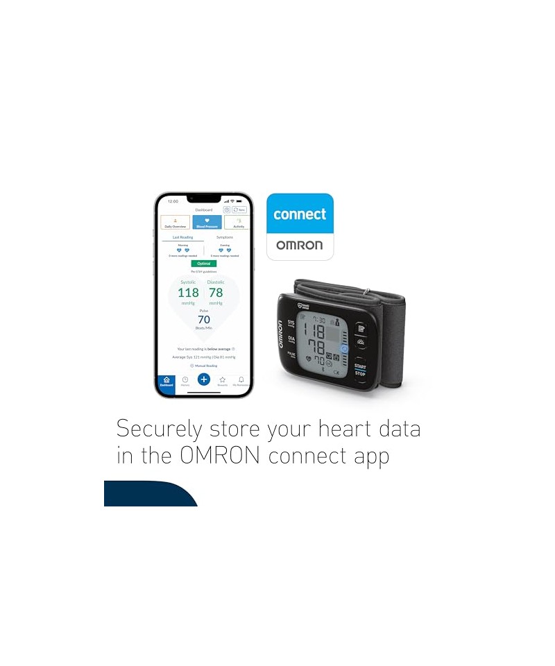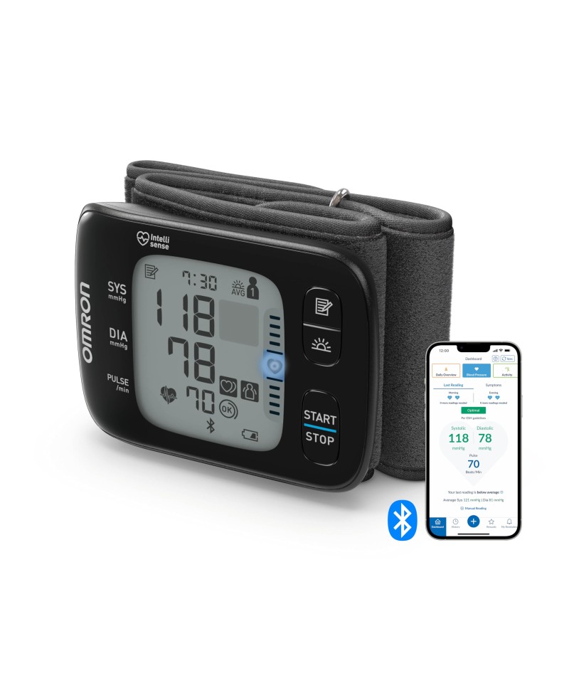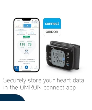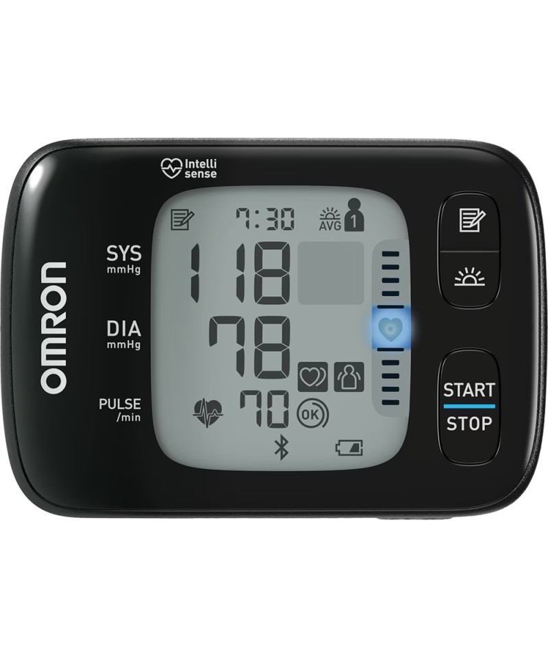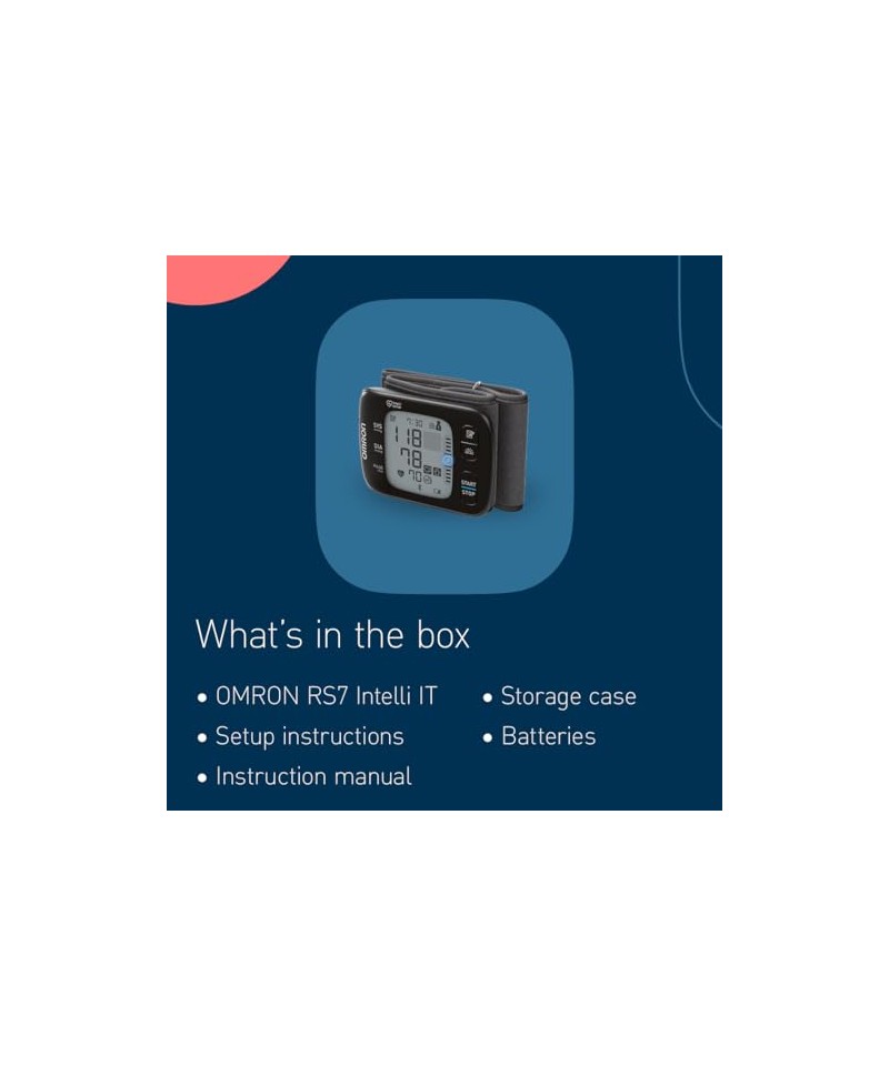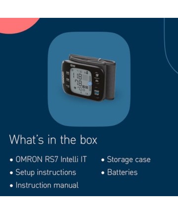 Omron RS7 Intelli IT este proiectat pentru a masura tensiunea şi pulsul la pacientii adulti cu circumferinta incheieturii mainii variind intre 13,5 cm si 21,5 cm. Aparatul detecteaza aparitia batailor neregulate ale inimii in timpul masurarii si ofera un semnal de avertizare.