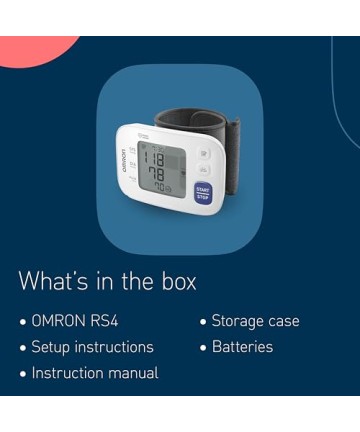 ARTICOLE INCLUSE: 1x monitor de tensiune arterială de încheietură OMRON RS4, manual de instrucțiuni, fișă de tensiune arterială, baterii, husă de depozitare