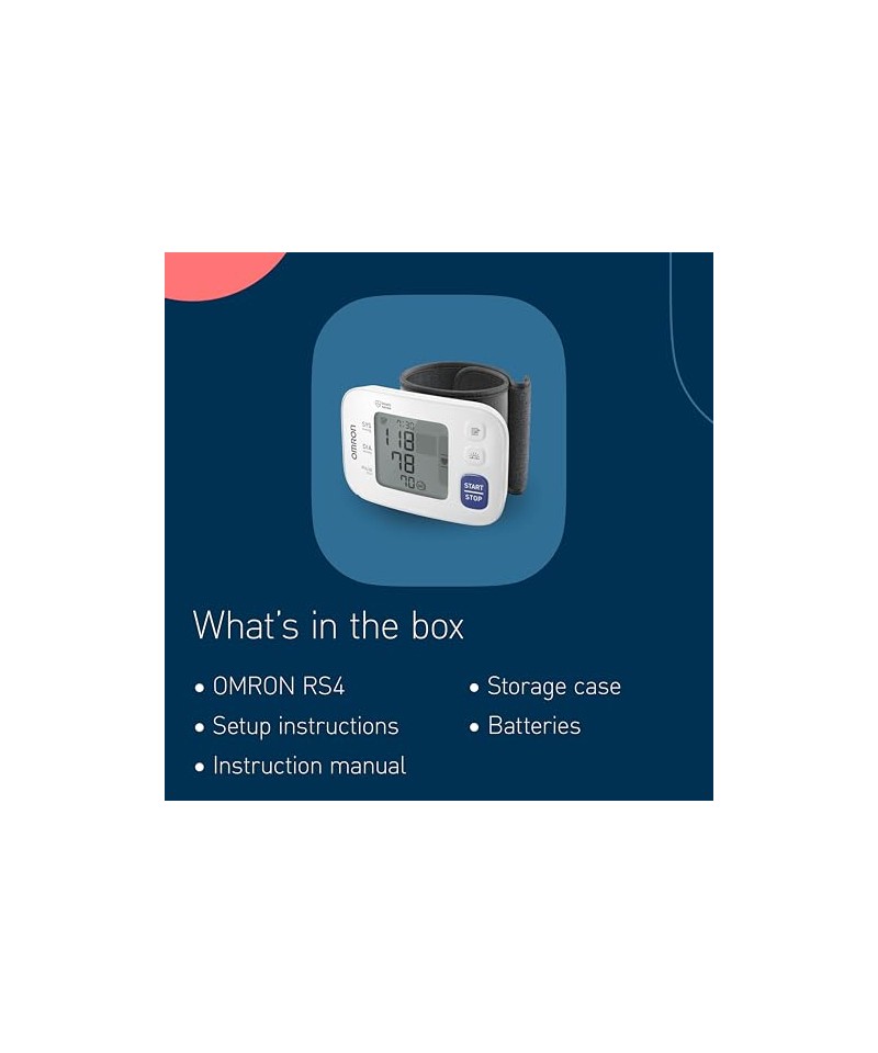 ECHIPAMENT DE MĂSURARE A TENSIUNII ARTERIALE UȘOR DE UTILIZAT ACASĂ: puneți monitorul de încheietură OMRON RS4 portabil, care măsoară 13,5-21,5 cm, și ridicați încheietura la nivelul inimii pentru o citire precisă în câteva secunde