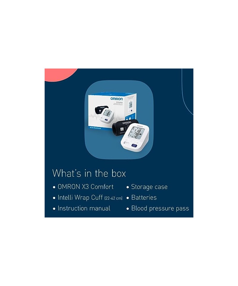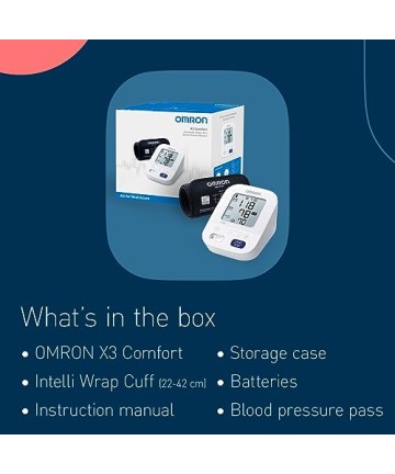 ARTICOLE INCLUSE: 1 x monitor de tensiune arterială OMRON X3 Comfort cu manșetă Intelli Wrap de 22-42 cm, baterii, manual de instrucțiuni și trusă de depozitare
