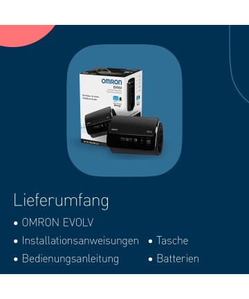ELEMENTE FURNIZATE: 1 x monitor de tensiune arterială wireless EVOLV, manșetă de braț Intelli Wrap de 22-42 cm, 4 x baterii AAA, manual de instrucțiuni, toc de depozitare; descărcați aplicația gratuită OMRON connect (pentru iOS/Android) pentru acces ușor la citiri