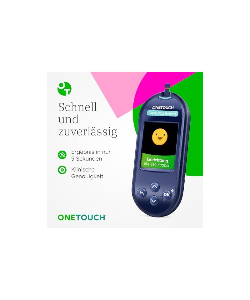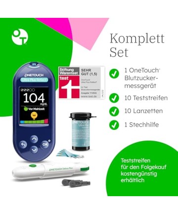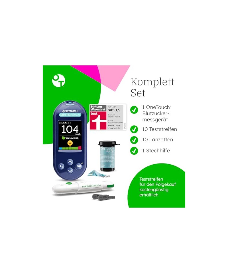 „Foarte bine” acordat de STIFTUNG WARENTEST: Indicatorul OneTouch Ultra Plus Reflect a fost evaluat de Stiftung Warentest cu premiul „Foarte bine” [1,5]. * În domeniile preciziei (repetabile), punerii în funcțiune ușoare și manipulării regulate, indicatorul funcționează foarte bine. Elementele de afișare și control primesc, de asemenea, calificativul „Foarte bine” de la Stiftung Warentest. *Conform rezultatelor testelor Stiftung Warentest din noiembrie 2024