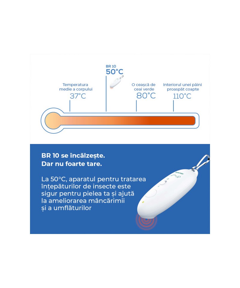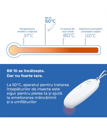 BR10 utilizează tehnologia avansată cu căldură, de aceea poate calma instantaneu mâncărimea și poate reduce umflăturile și iritațiile cauzate de înțepături. Cu ajutorul acestui dispozitiv eficient, poți obține alinare rapidă și vei putea reveni la activitățile tale preferate fără să-ți faci griji.