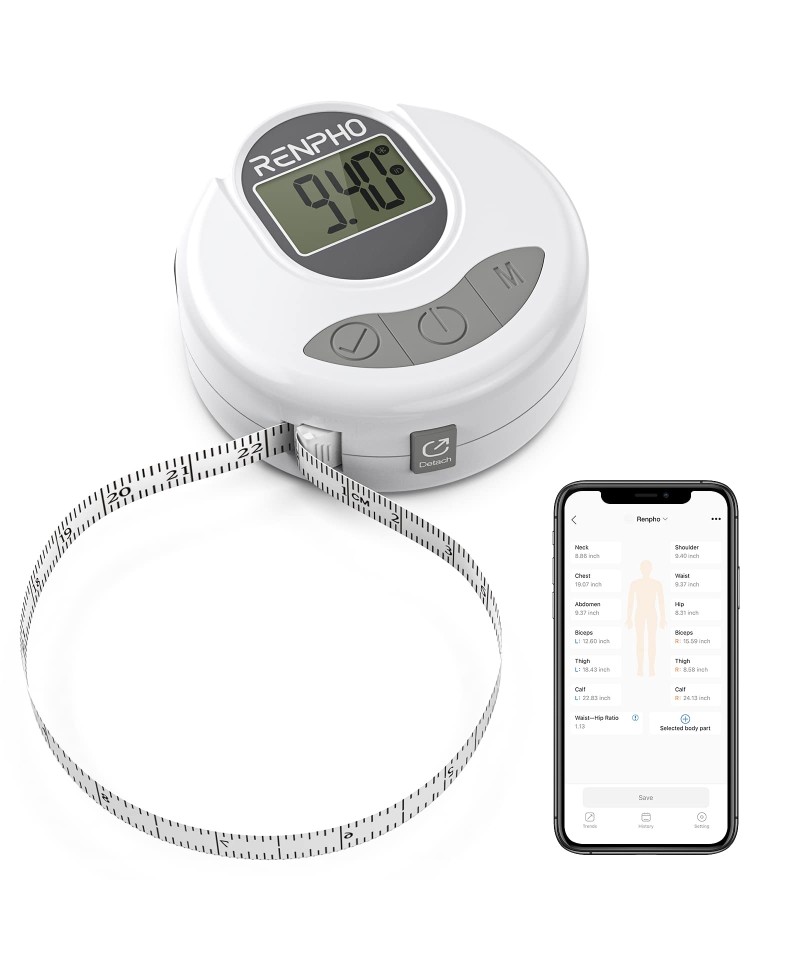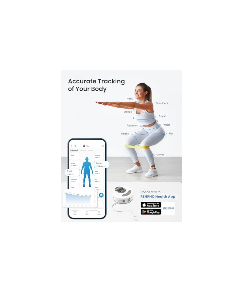 Atingeți-vă obiectivele de fitness: Ruleta de măsurare inteligentă RENPHO este compatibilă cu aplicația Renpho Health, care vă permite să înregistrați măsurătorile a 12 zone-cheie ale corpului, 6 părți personalizate și să obțineți ușor raportul talie-șold. Datele sunt prezentate într-un grafic ușor de citit pentru o analiză și urmărire ușoare, permițindu-vă să vă mențineți pe drumul către obiectivele de fitness.