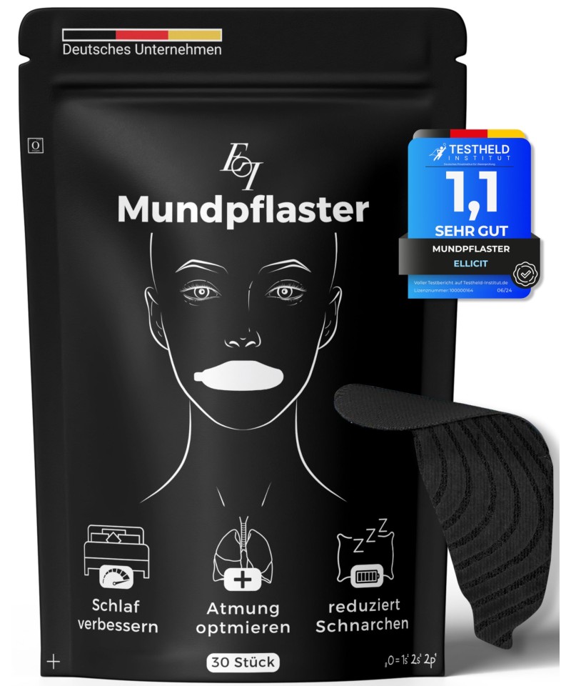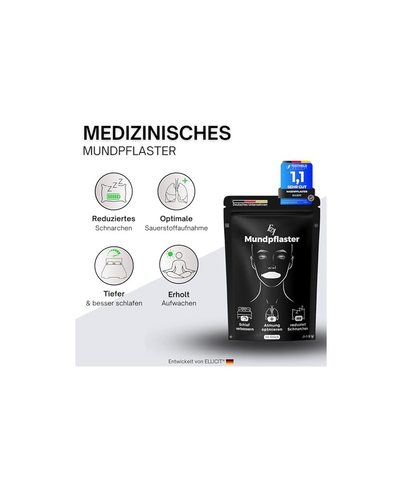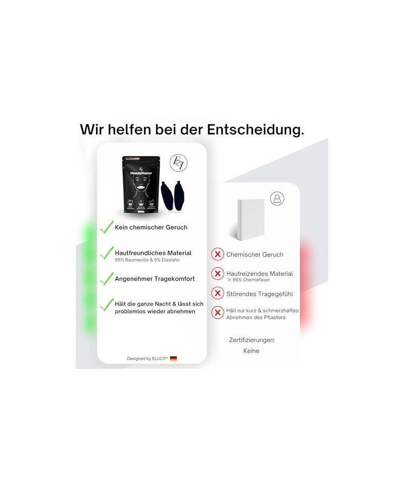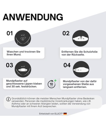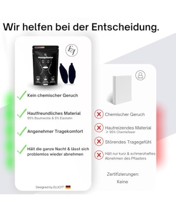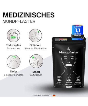 Fără efecte secundare: Plasturii noștri bucali anti-sforăit Ellicit nu conțin ingrediente active, sunt testați și aprobați ca dispozitiv medical. Comparativ cu medicamentele, oferim o alternativă fără efecte secundare pentru un somn odihnitor.