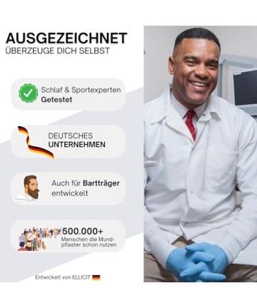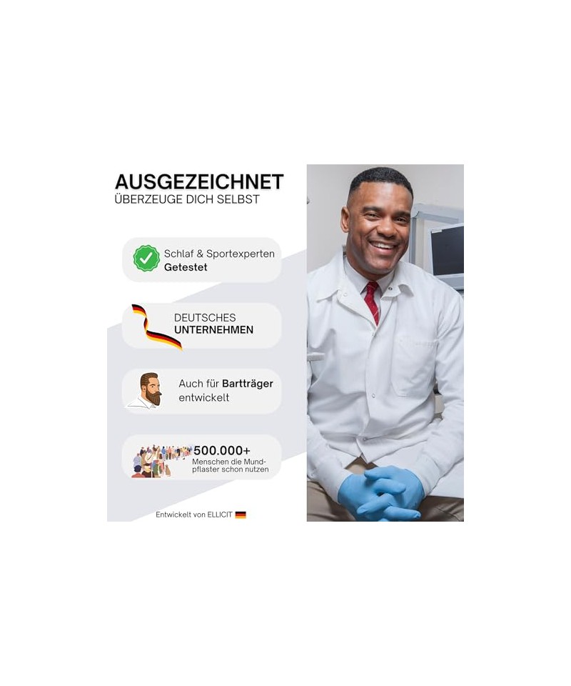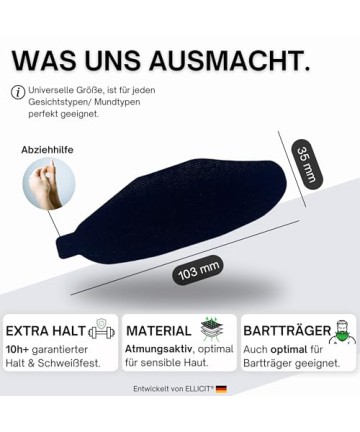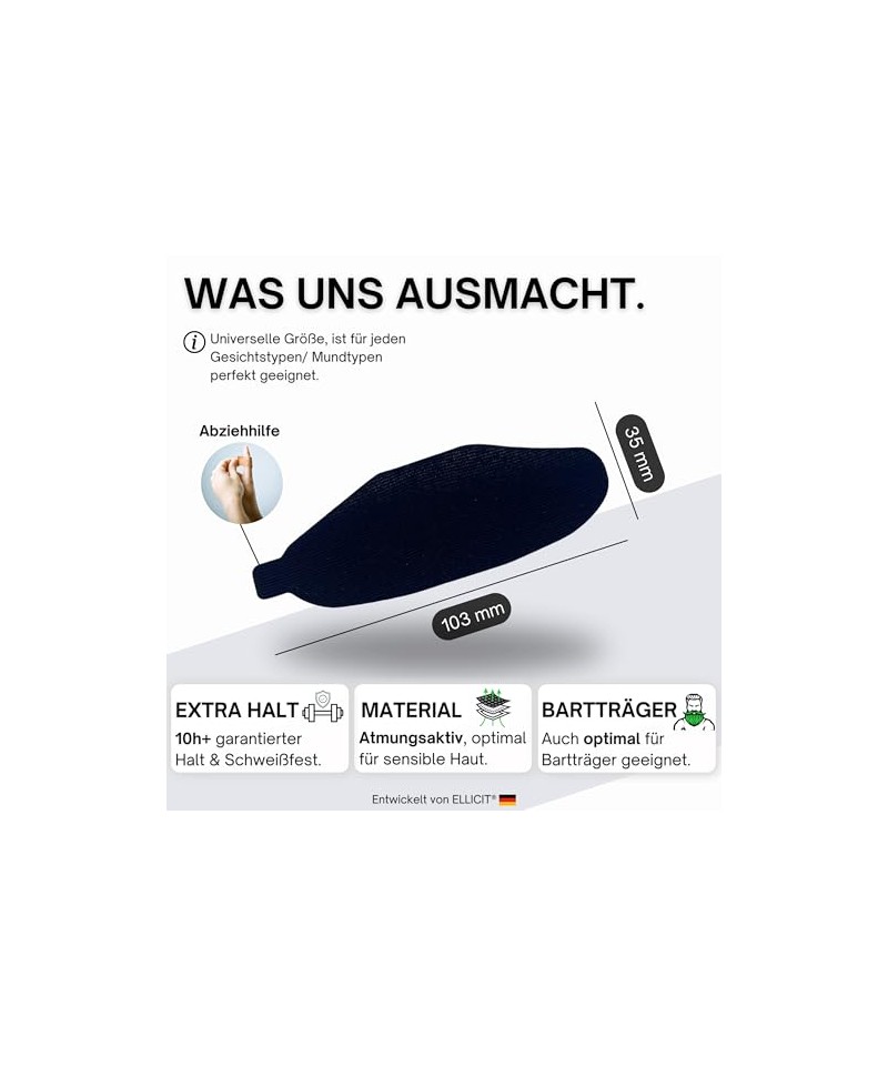 Dimensiune universală: cu o dimensiune de 103 mm x 35 mm și forma noastră special dezvoltată, banda bucală Ellicit se adaptează oricărei guri, pentru confort maxim și fixare fermă (potrivită și pentru cei care poartă barbă).