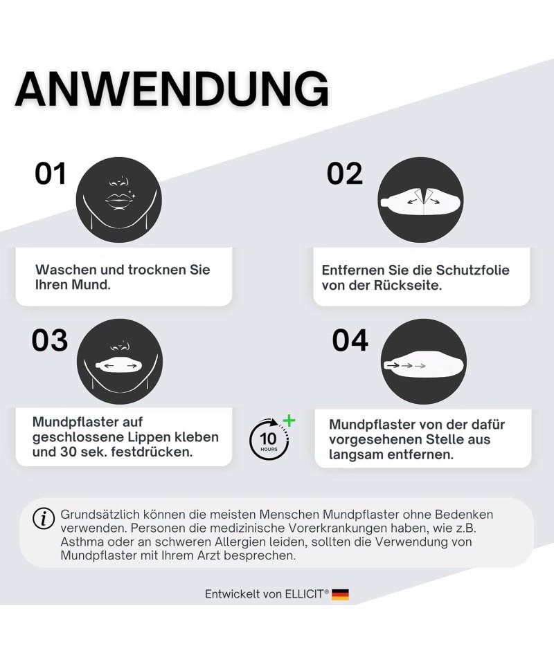 Sforăit: Plasturii bucali anti-sforăit mențin gura închisă în timpul somnului, ceea ce promovează respirația nazală naturală. Datorită circulației nestingherite a aerului peste nas, sunt prevenite zgomotele respiratorii deranjante, cum ar fi sforăitul.