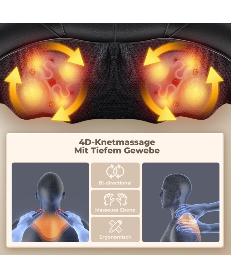 Masaj profund: opt bile de masaj 4D încorporate funcționează simultan cu masaj bidirecțional și trei viteze reglabile pentru a ameliora oboseala gâtului, umerilor, spatelui, șoldului, picioarelor și tălpilor și a ameliora tensiunea musculară.