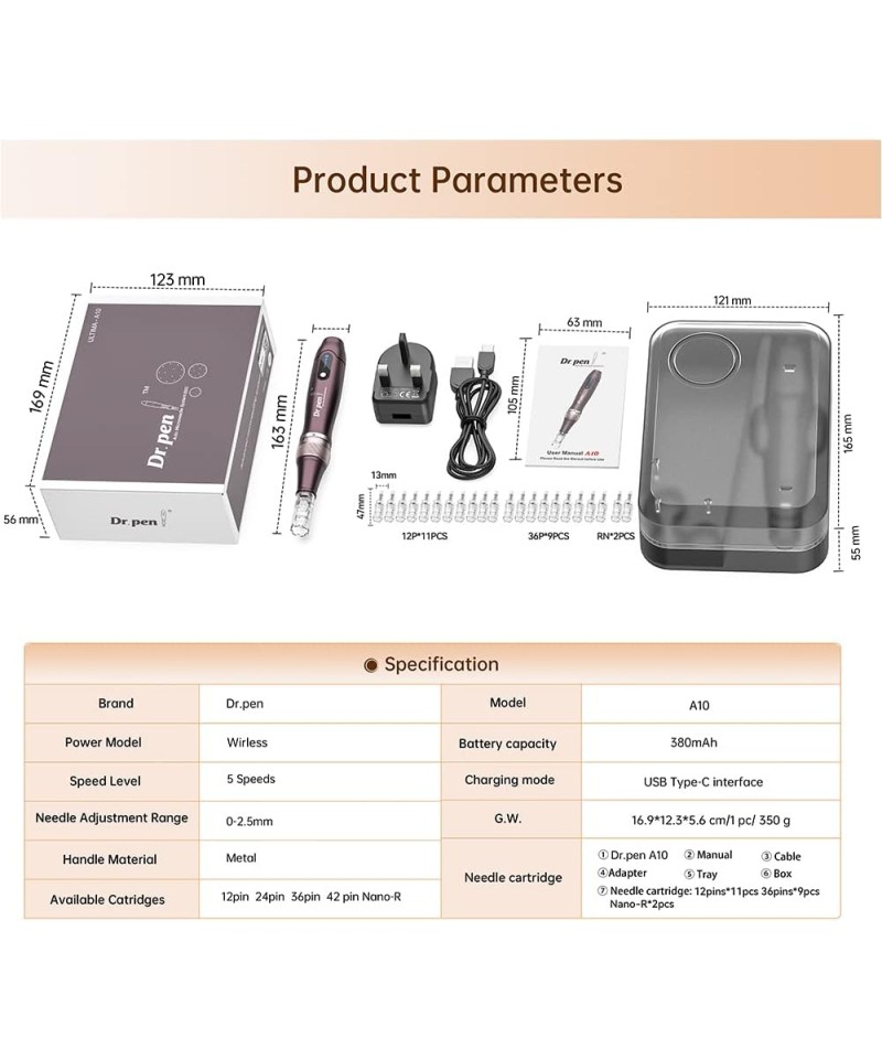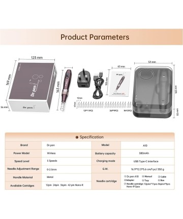 Dr. Pen A10 – modelul Wireless (cu acumulator), este un dispozitiv cu micro-ace, format din doua componente: dispozitivul in forma de stilou care functioneaza fara fir cu ajutorul acumulatorului incorporat si un cartus cu micro-ace. Se poate utiliza de asemenea si conectat cu cablul de alimentare la priza in cazul in care acumulatorul s-a consumat
