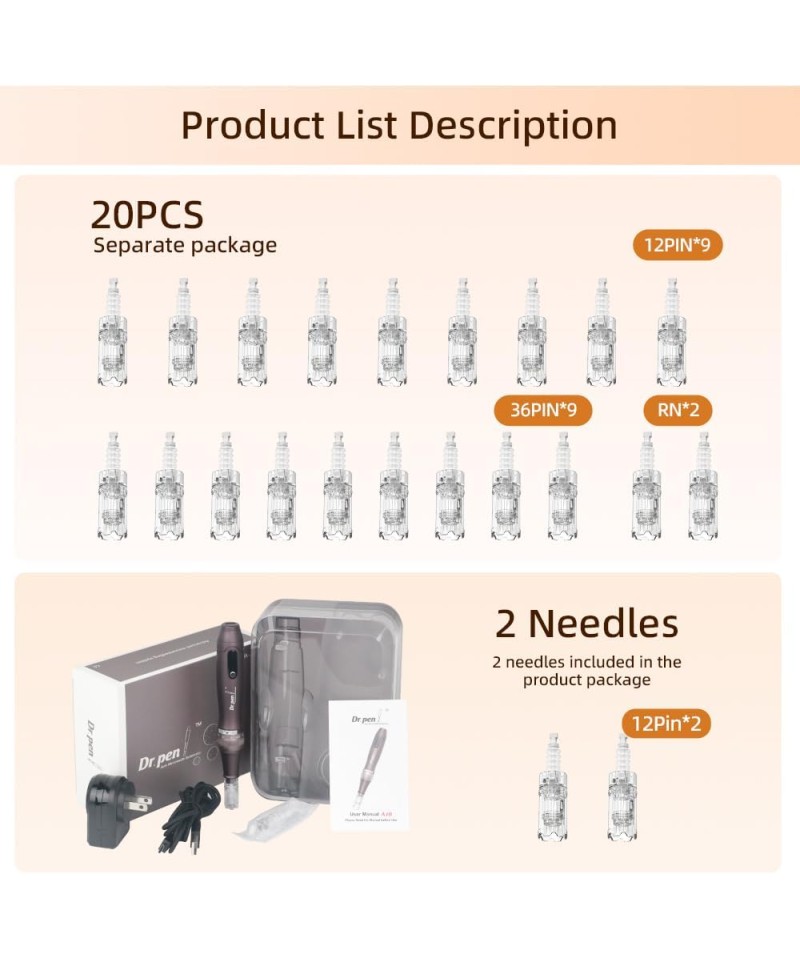 Aparatul de microneedling vine cu 20 de cartușe, sterile și ambalate individual. Acestea conțin 12 pini x 11 buc, 36 de pini x 9 buc Nano-Rx 2 buc. Pagina noastră de detalii are o descriere detaliată a fiecărui tip de cartușe.
