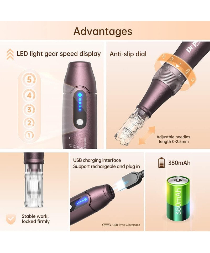 Aparatul de microneedling are 5 niveluri de reglare, fiecare nivel corespunde nevoilor dumneavoastră diferite. Aparatul poate funcționa stabil și continuu, dacă aveți întrebări, vă rugăm să contactați serviciul nostru de asistență pentru clienți.