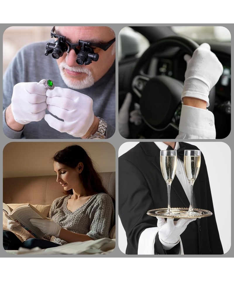 O manșetă elastică îngustă menține mănușile subțiri de bumbac la locul lor fără teama de alunecare. Cusătura dublă întărită este rezistentă la rupere și reutilizabilă. Perfecte pentru machiaj, verificarea etichetelor sau manipularea bijuteriilor sau a fotografiilor.