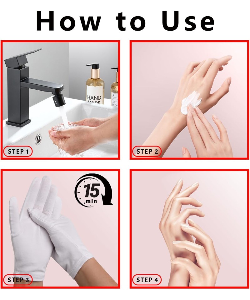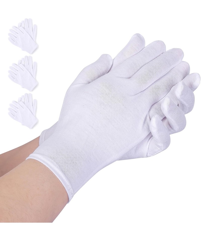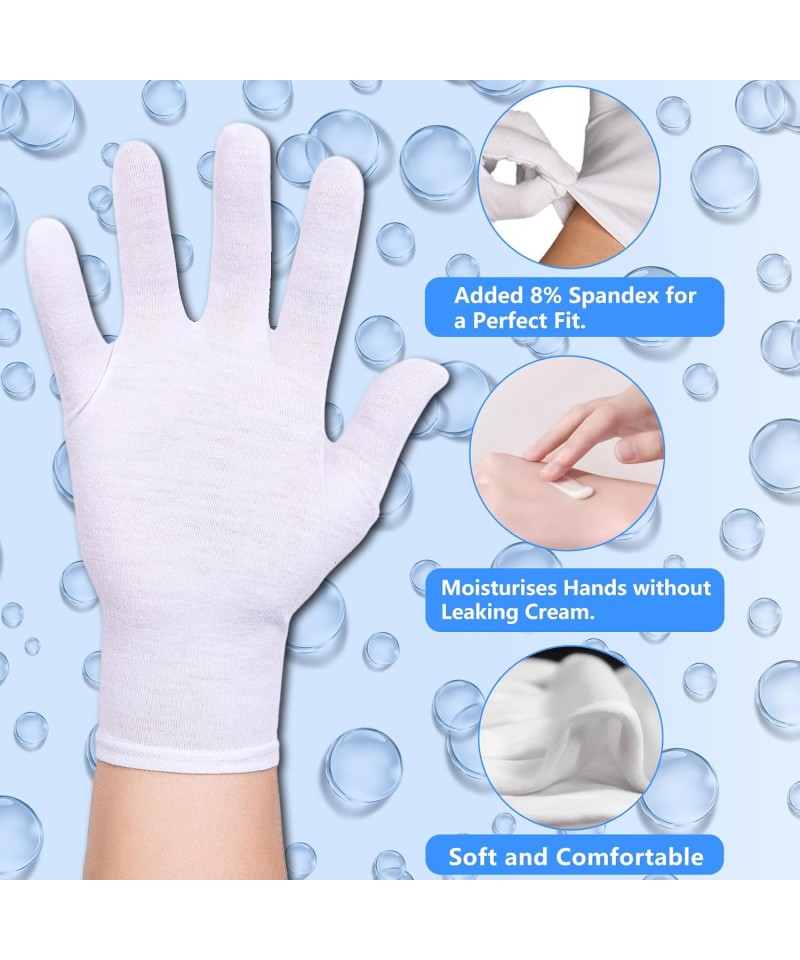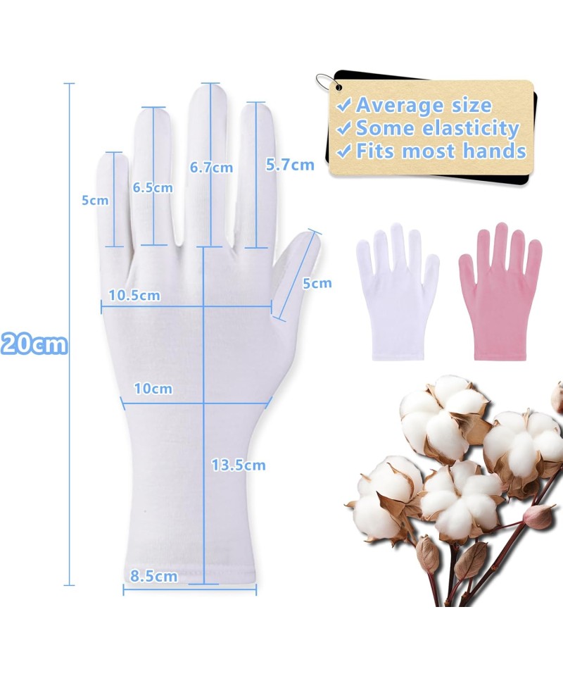 Mănușile de bumbac sunt fabricate dintr-un material respirabil de înaltă calitate. Mănușile pot fi purtate peste noapte pentru a bloca umezeala, a aplica o cremă hidratantă sau cremă de mâini, apoi le pot pune la loc pentru a calma mâinile uscate sau eczemele.