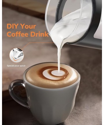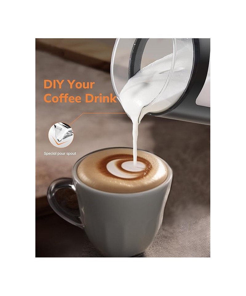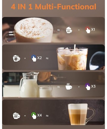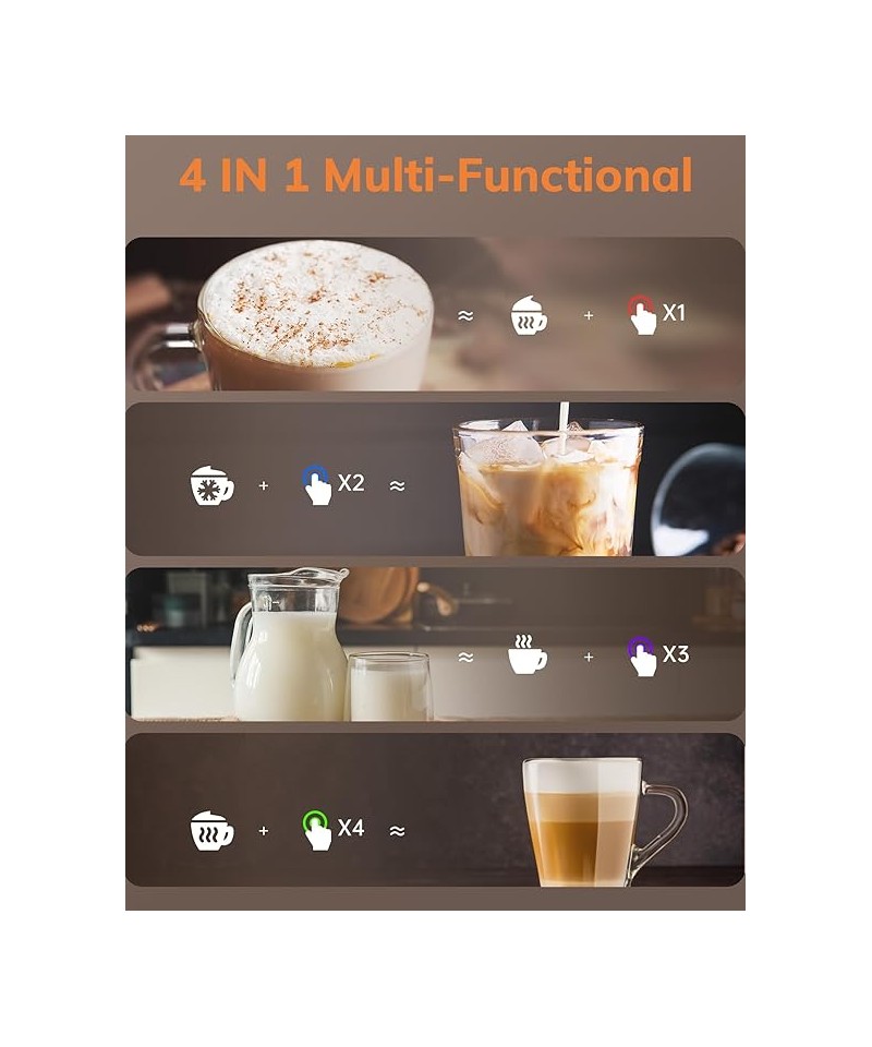 Aparat de spumat lapte 4 în 1 pentru spumare și încălzire a laptelui, cu funcții pentru spumă caldă, rece, densă sau aerisită, activabile printr-un singur clic.