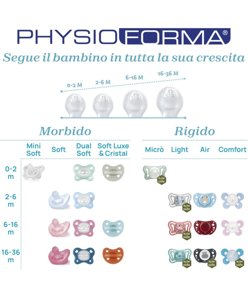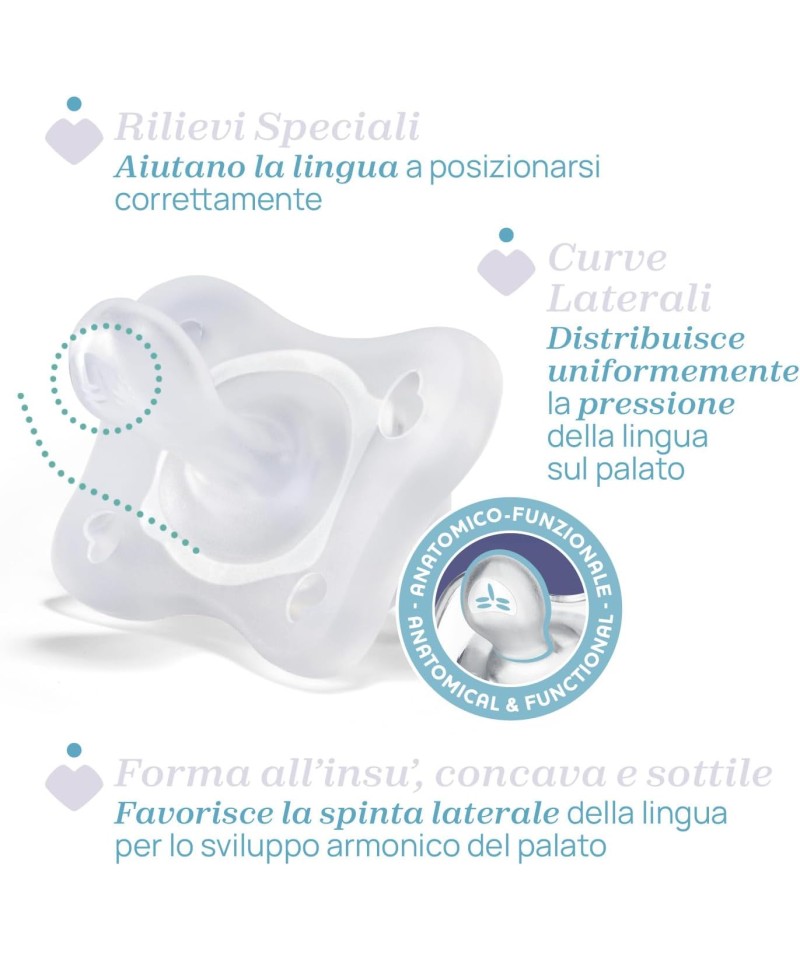 Suzetele Chicco PhysioForma au fost dovedite a antrena toate funcțiile gurii importante pentru o creștere sănătoasă: respirația, sugerea, înghițirea, mestecatul și fonația.