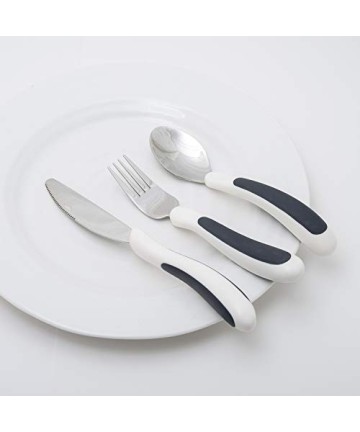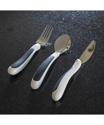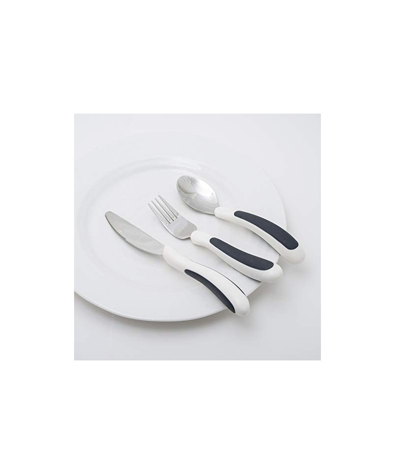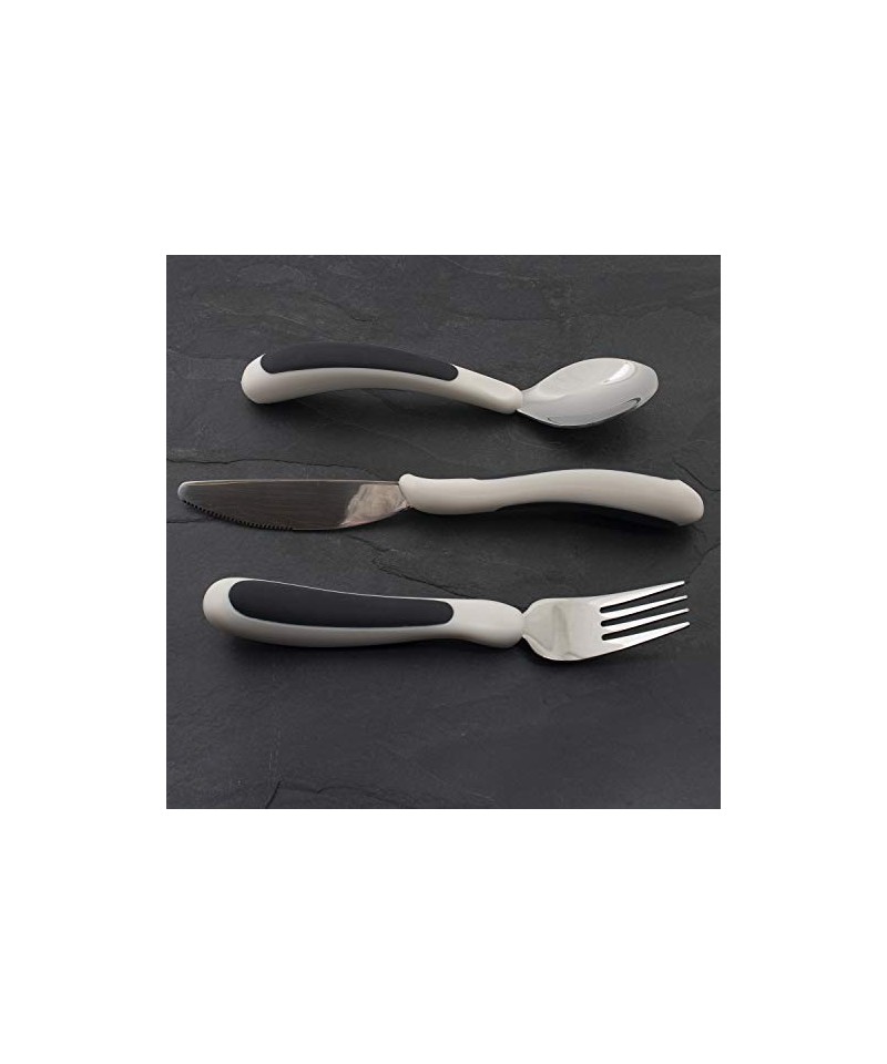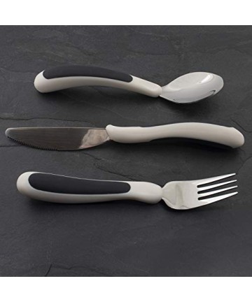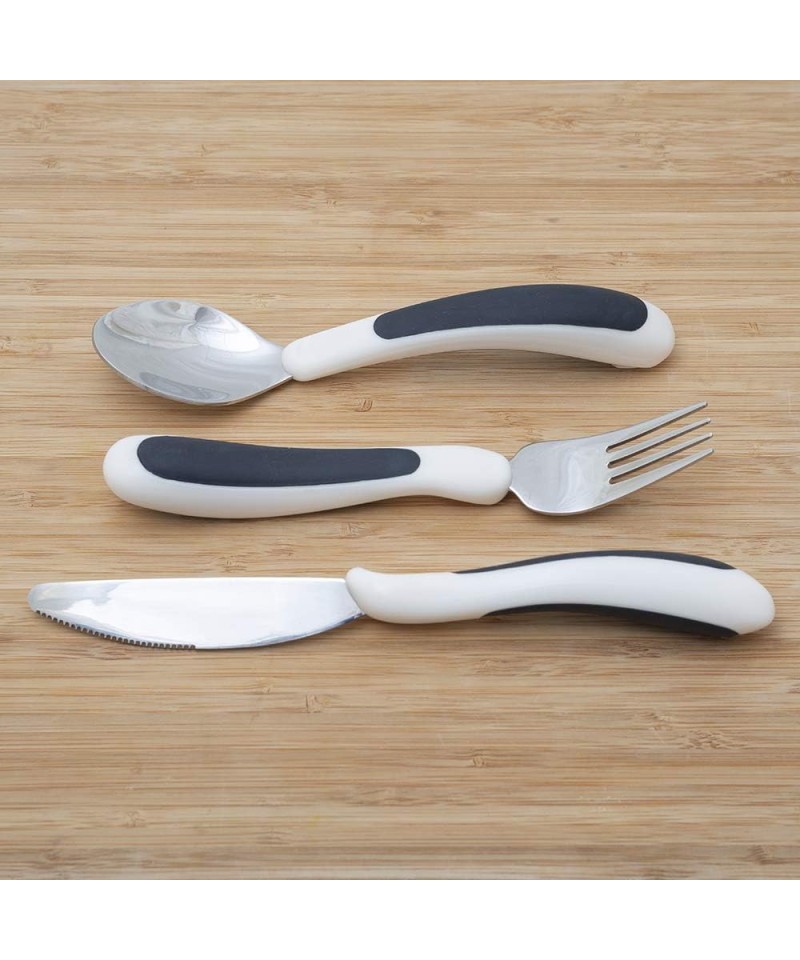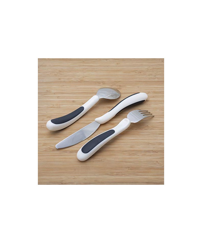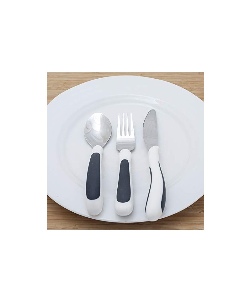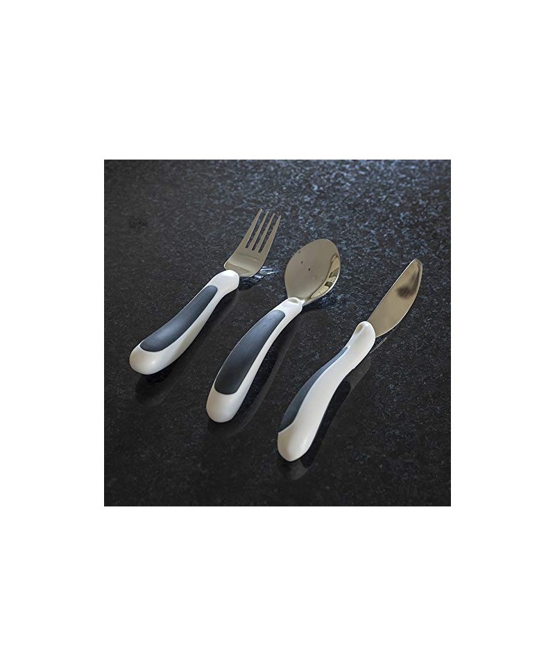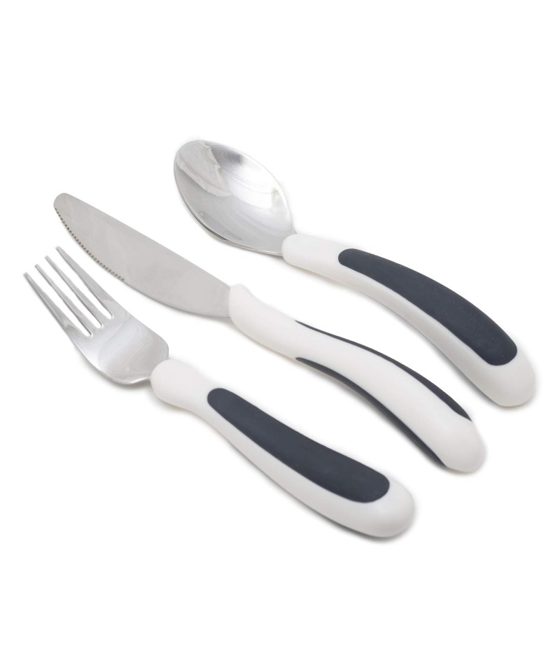 Setul ergonomic de tacâmuri pentru adulți Kura Care M80270 de la NRS Healthcare include câte o lingură de masă, o furcuță și un cuțit, toate proiectate ergonomic.