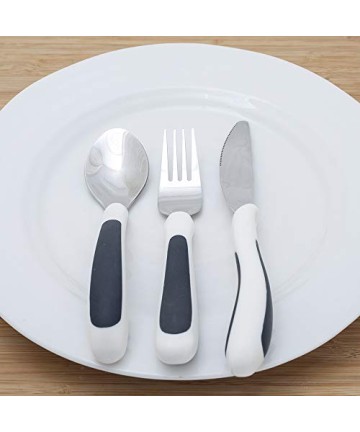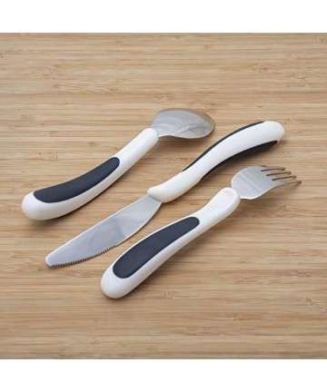 Lingură mai adâncă pentru a evita vărsarea lichidelor, furcuță mai largă pentru a ridica alimentele mai ușor, cuțit cu lamă zimțată pentru tăiere mai convenabilă.