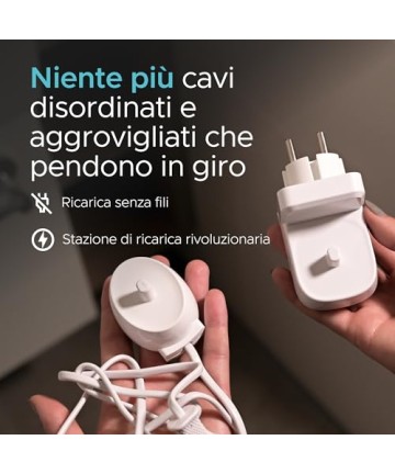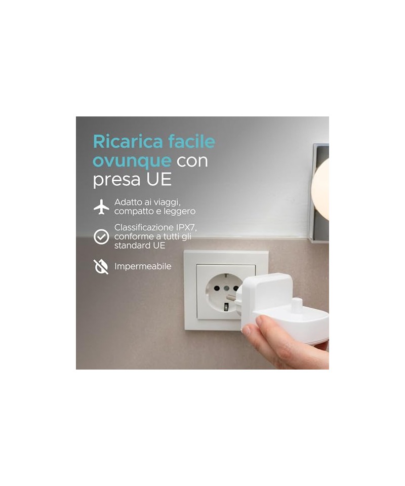 Încărcarea periuței de dinți este simplă. Pur și simplu conectați-o la orice priză UE și aveți periuța de dinți gata de utilizare, oriunde v-ați afla. Nu sunt necesare cabluri sau dispozitive suplimentare!