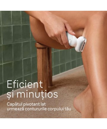 - Rapid și eficient: Capătul pivotant lat urmărește fără efort contururile corpului pentru o epilare eficientă. Epilatorul prinde firele de păr scurte (0,5 mm) pe care ceara nu le poate prinde.
