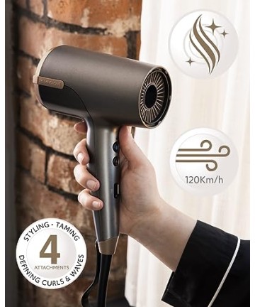 Uscător de păr rapid și puternic de 2.000 waţi cu patru accesorii de coafare: Accesoriul anti-scăpare pentru îmblânzirea părului rebel (fire de păr) Difuzor pentru uscare delicată Difuzor pentru definirea buclelor Duză de coafare îngustă, accesoriu pieptene fin și lat