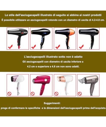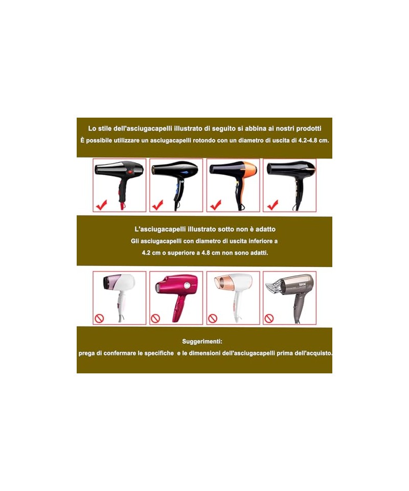 Atenție: Potrivit pentru uscătorul de păr cu un diametru de 4,2-4,8 cm. Difuzorul este potrivit pentru cele mai multe uscătoare de păr, dar nu este universal. Capătul uscătorului de păr unde conectăm difuzorul trebuie să măsoare cel puțin 1,65 inch și maximum 1,9 inch, deci asigurați-vă că măsurați duza uscătorului de păr și vedeți dacă acest difuzor este potrivit pentru uscătorul de păr curent înainte de a cumpăra.