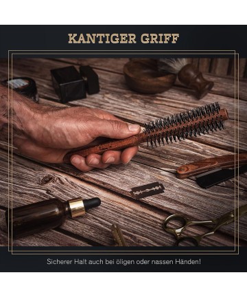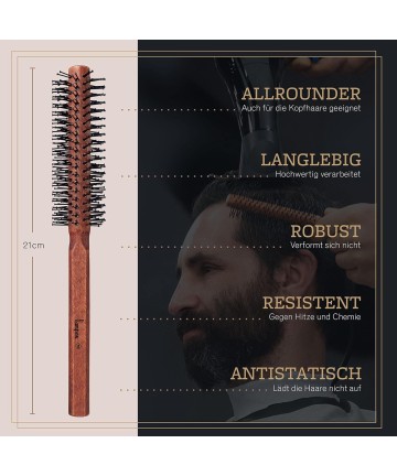 Clienții noștri spun: perfectă pentru îngrijirea bărbii. Peria rotundă practică are un mâner ergonomic din lemn și știfturi robuste pentru pieptănare, descurcare și stilizare.