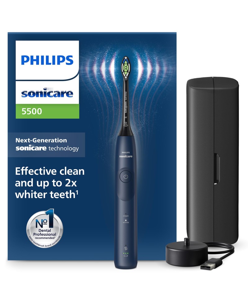 Philips Sonicare 5500 vă ajută să obțineți o îndepărtare a plăcii bacteriene de până la 7 ori mai mare și îndepărtează petele de suprafață pentru dinți strălucitori și de până la 2 ori mai albi.