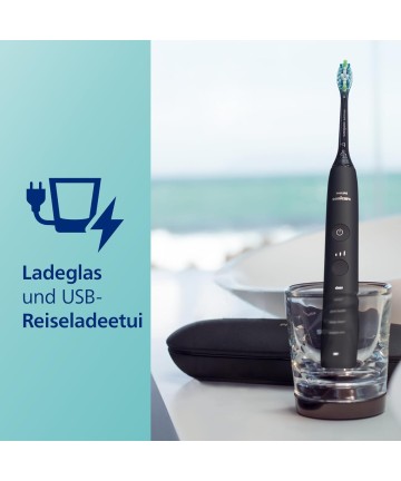 Conține: 1 x mâner Philips Sonicare DiamondClean 9000, 1 x cap de perie, o bază de încărcare, un suport de încărcare în cană și o husă de încărcare USB