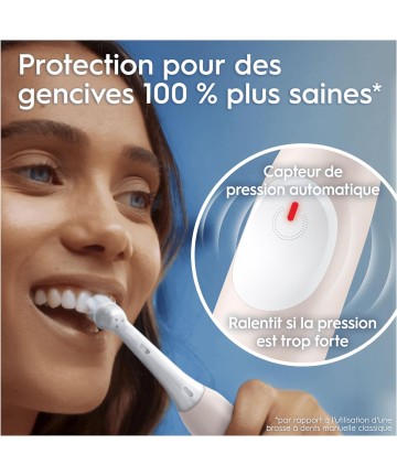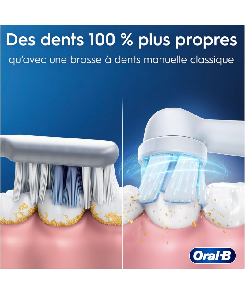 ÎNDEPĂRTEAZĂ CU 100% MAI MULTĂ PLACĂ BLOCĂ față de o periuță de dinți manuală obișnuită cu CEA MAI AVANSATĂ TEHNOLOGIE iO de la Oral-B: PUTERNICĂ CU PLACA BLOCĂ, DELICATĂ CU GINGIILE