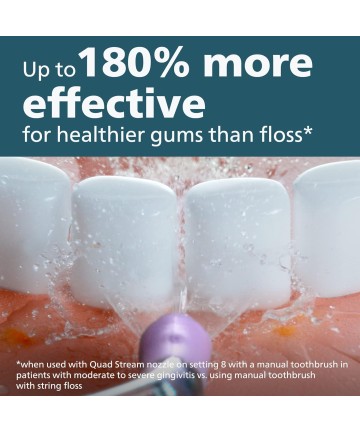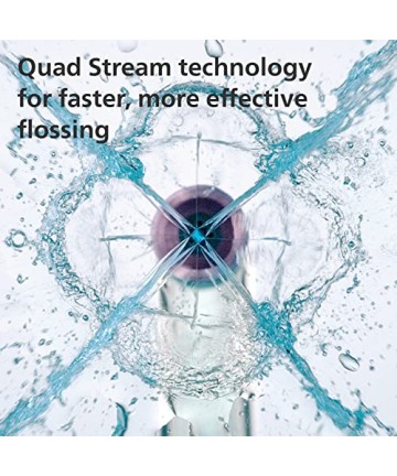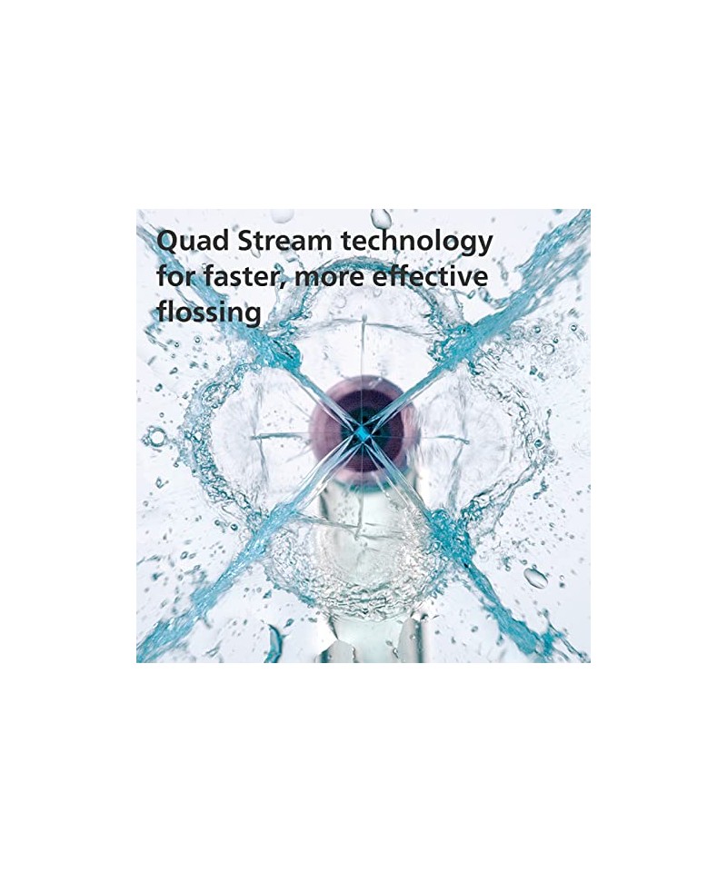 Quad Stream oferă patru jeturi largi de apă care pătrund adânc între dinți și de-a lungul liniei gingivale, acoperind de 9 ori suprafața aței dentare cu un singur jet