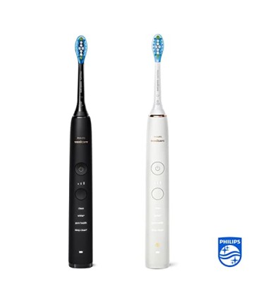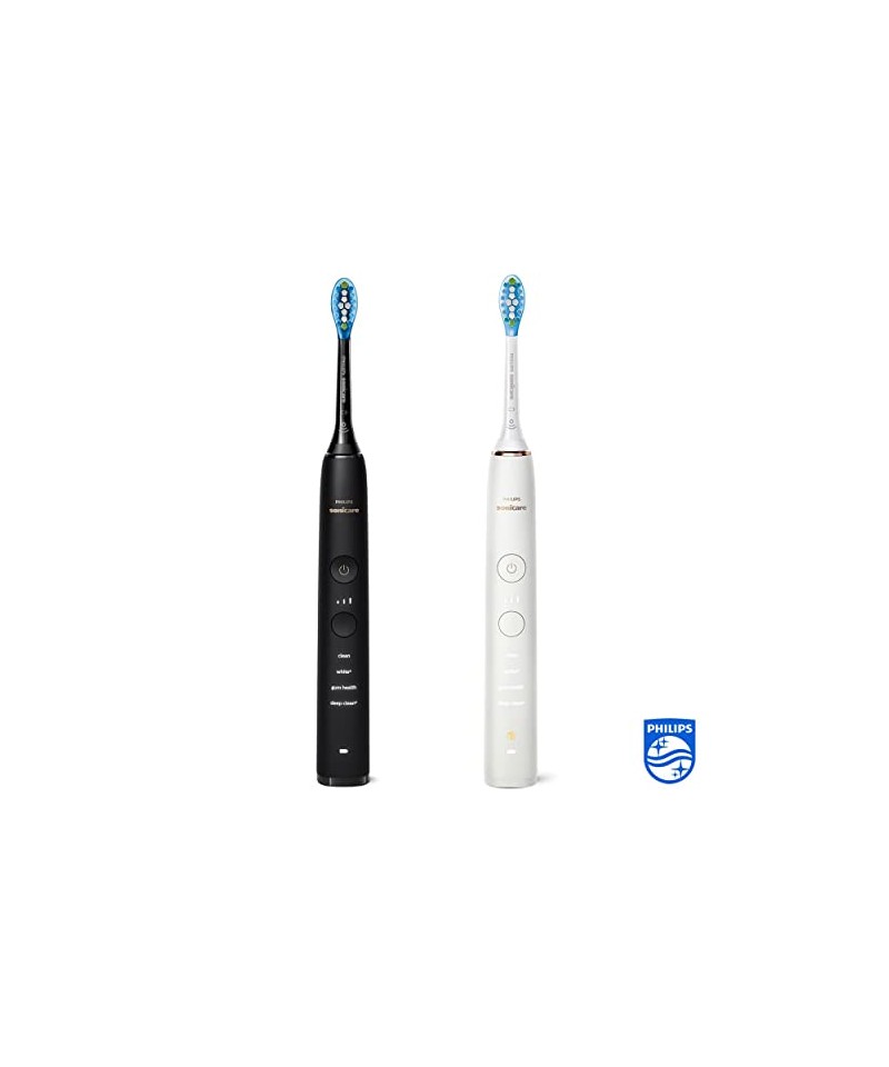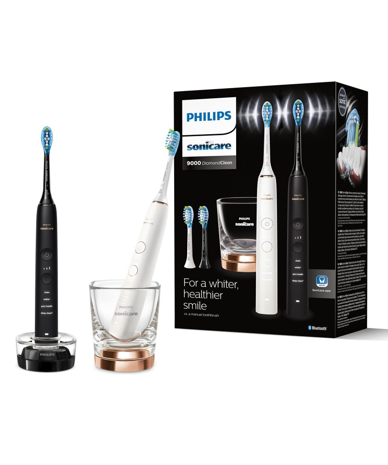 Setul include: 2 periuțe de dinți electrice Philips Sonicare DiamondClean Series 9000, în negru și alb perla, 2 capete de perie C3 Premium Plaque Defence, 1 pahar din sticlă, 2 suporturi de încărcare