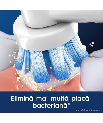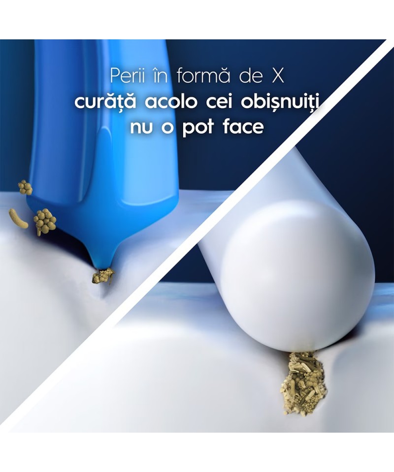 Capetele de periaj Oral-B au peri in forma de X care s-a dovedit clinic ca se adapteaza si ajung pe toate suprafetele dintilor, indepartand placa bacteriana pe care perii obisnuiti nu o pot atinge pentru o curatare mai buna si eficienta.