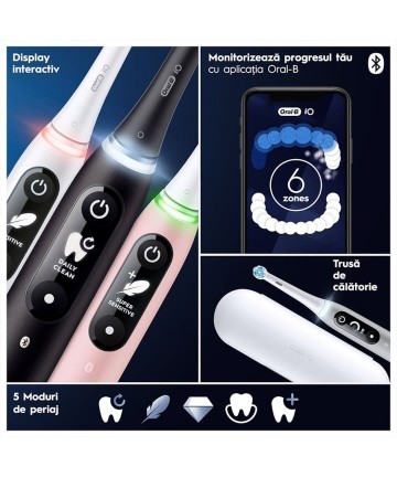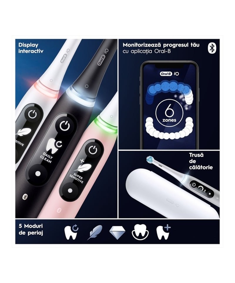 Continut pachet: 1 x Periuta de dinti iO6, 2 x Capate de periaj, 1 x Incarcator, 1 x Carcasa de calatorie