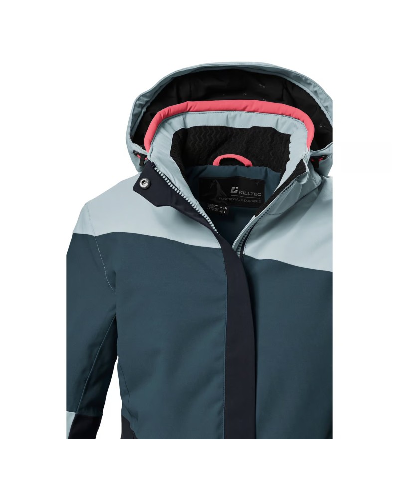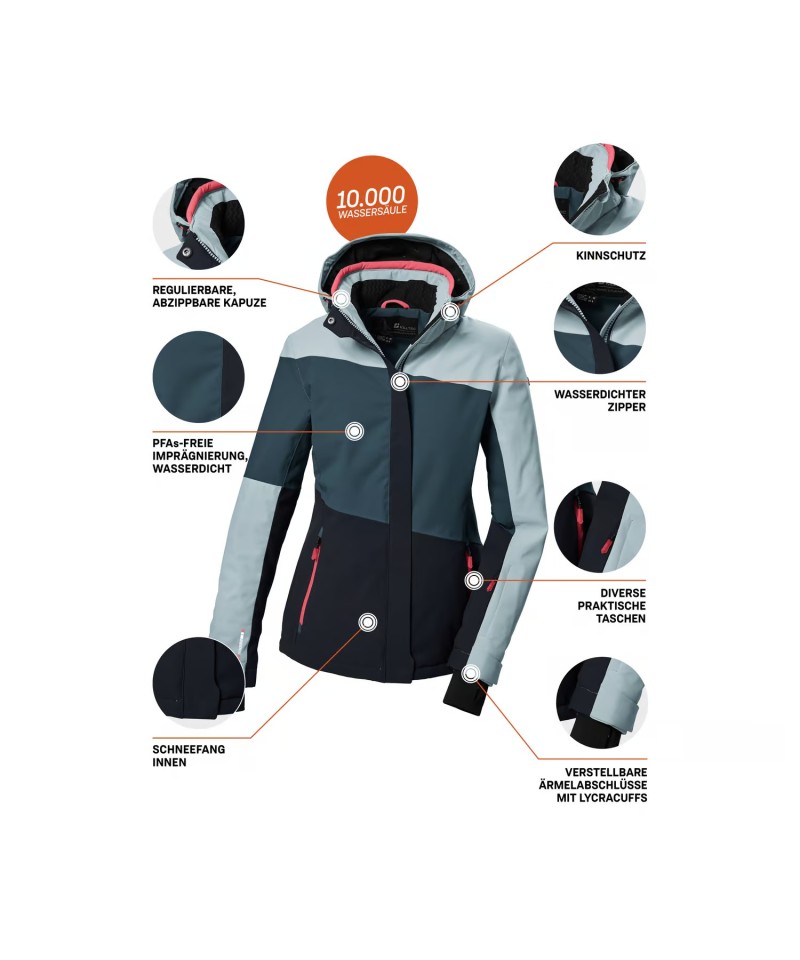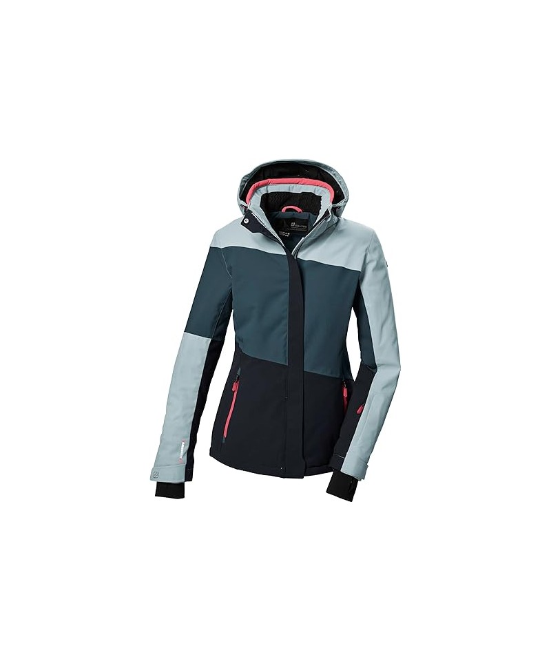 Cu geaca de schi pentru femei de la killtec, plăcerile pârtiilor pot începe. Geaca impresionează prin designul său dinamic colorblock în culori la modă și numeroasele caracteristici practice.