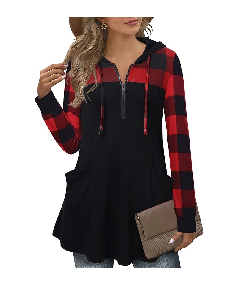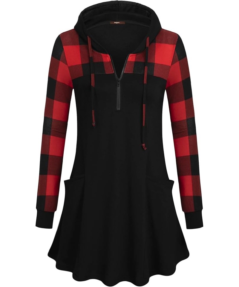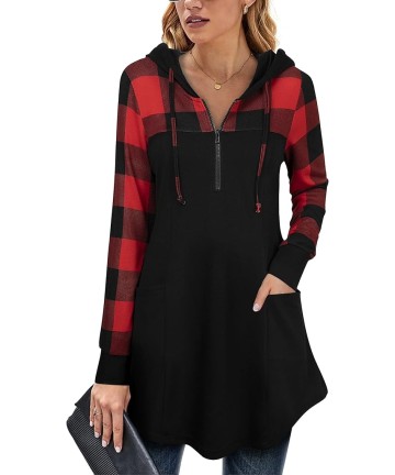 Hanorac de damă, pulover cu glugă și fermoar pe un sfert, decolteu în V, carouri în blocuri de culoare, pulover cu mânecă lungă, glugă cu șnur de strângere, croială lejeră, topuri maternitate/alăptare, tiv în linie A, hanorace tunică tricotate cu buzunare.