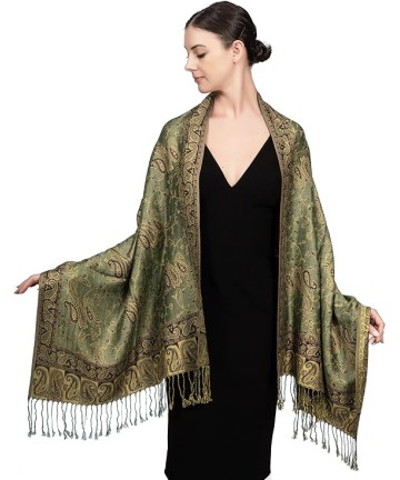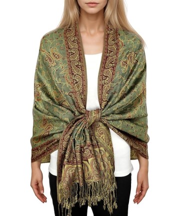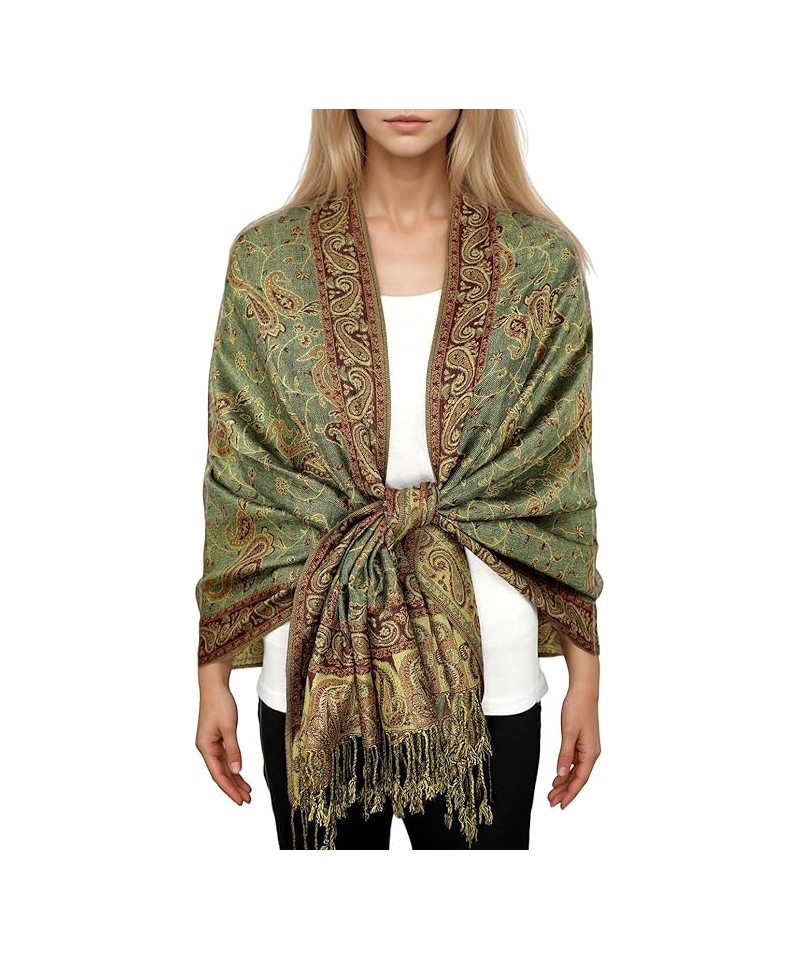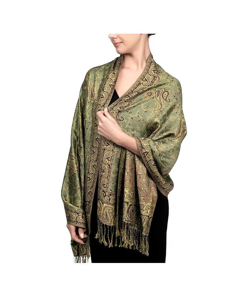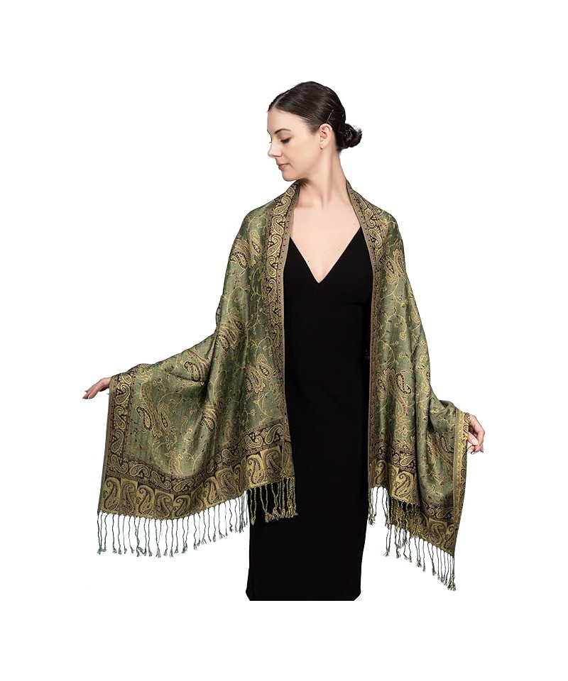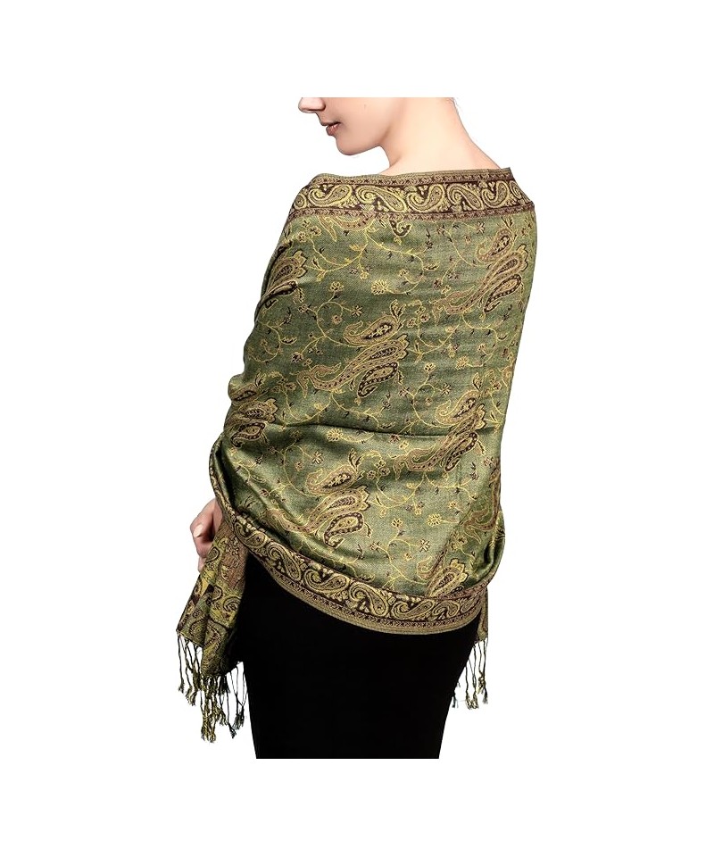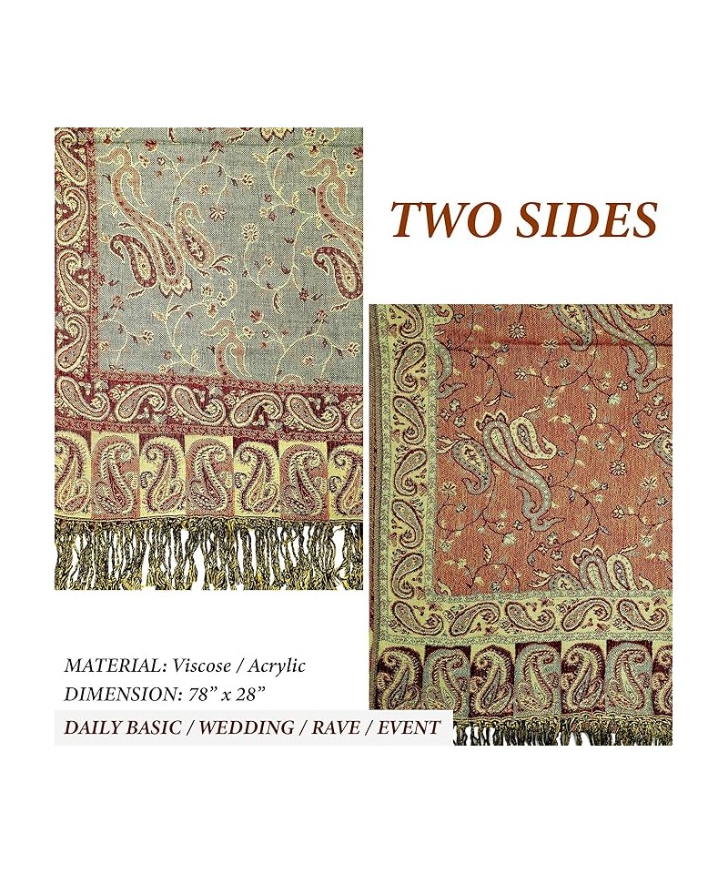 Această pashmina exotică are un model paisley și un strat dublu de material. Purtați-o peste cap, înfășurată în jurul gâtului, legată la talie sau drapată peste brațe. Sau pur și simplu lăsați-o să zboare în spatele vostru în vânt. Această pashmina reversibilă paisley poate fi folosită și ca o pătură ușoară pentru a o lua cu dvs. în plimbări în natură sau agățată deasupra patului ca accesoriu de perete. Această eșarfă pentru toate anotimpurile este un accesoriu frumos și versatil pentru... garderobă.