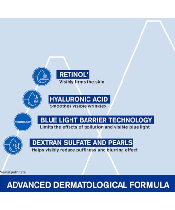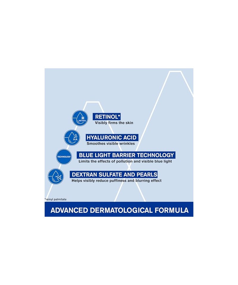 Actioneaza simultan asupra ridurilor, fermitatii conturului ochilor si asupra agresiunii zilnice a pielii: lumina albastra, raze UV, poluare, stres, oboseala.