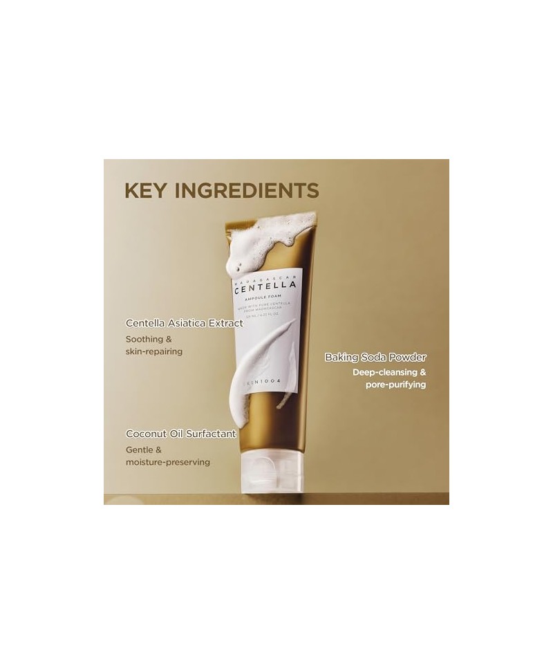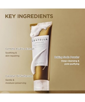 Centella Asiatica, bogată în vitamine, și bicarbonatul de sodiu, care purifică porii, hrănesc și împrospătează tenul iritat.