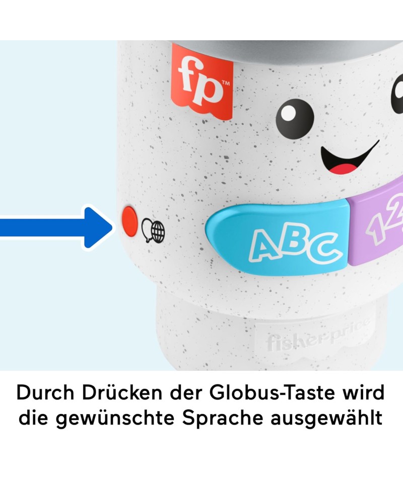 Pur și simplu apăsați cele două butoane pentru a activa peste 20 de melodii, sunete și fraze care le permit copiilor să învețe alfabetul, numerele și culorile. Cu butonul glob, se poate selecta o limbă: engleză, germană sau franceză.